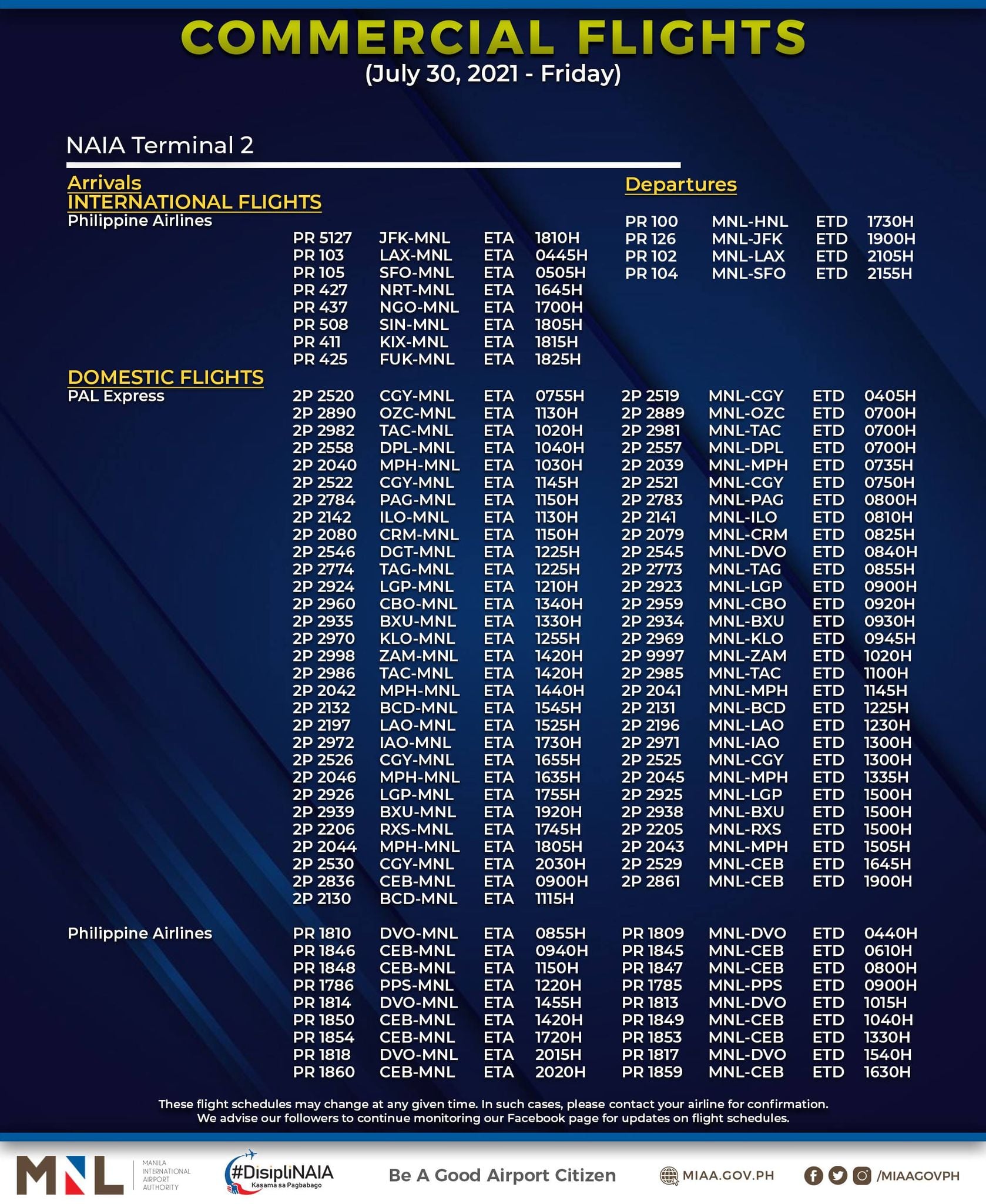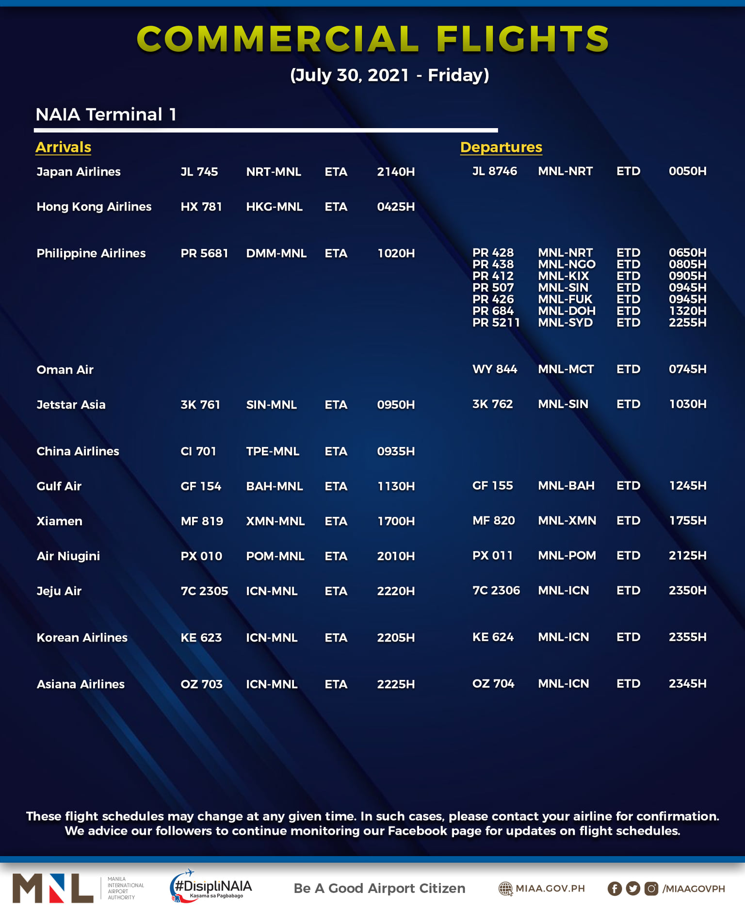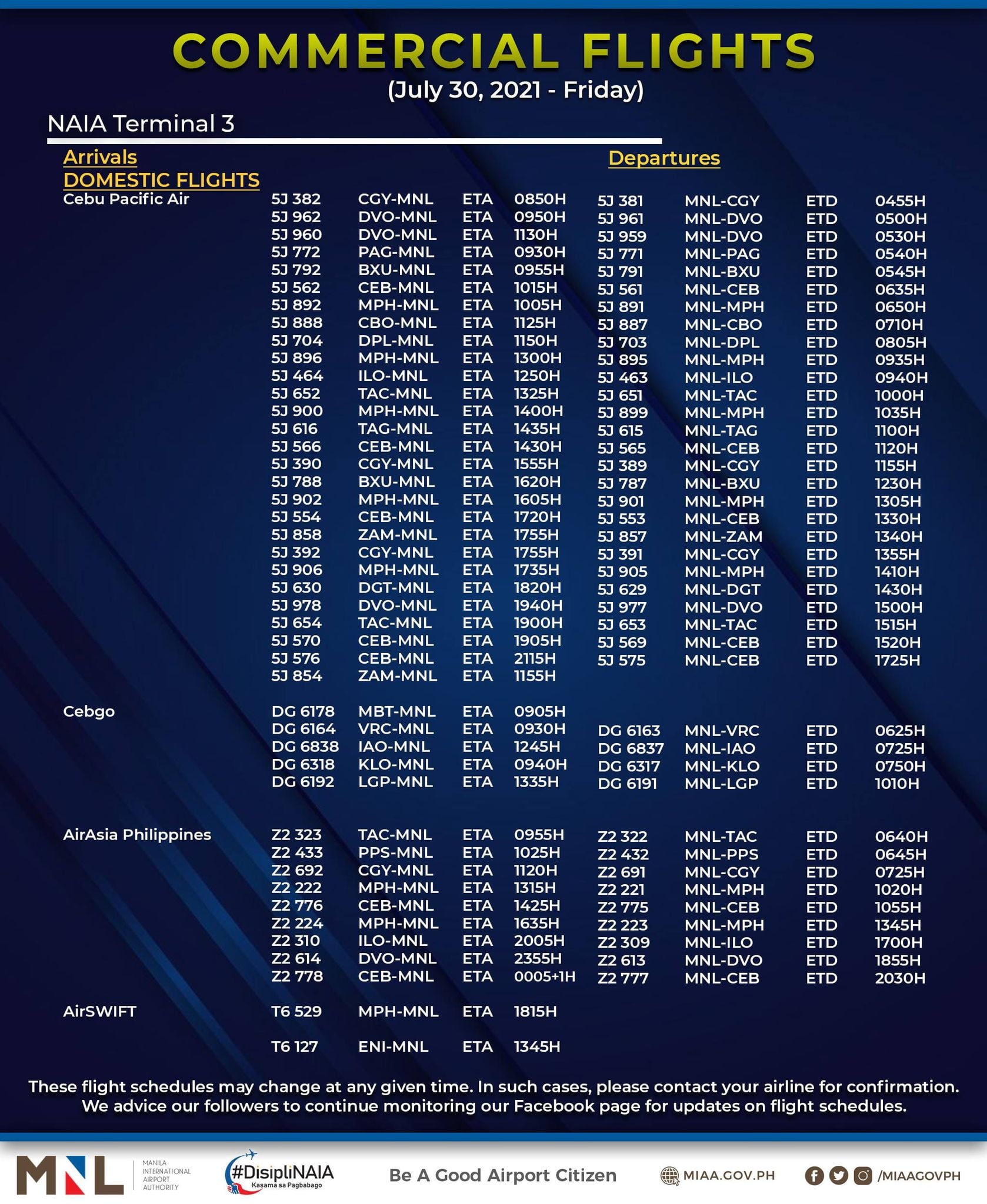 (Eagle News)–The Manila International Airport Authority has released its list of operational commercial flights for Friday, July 30: