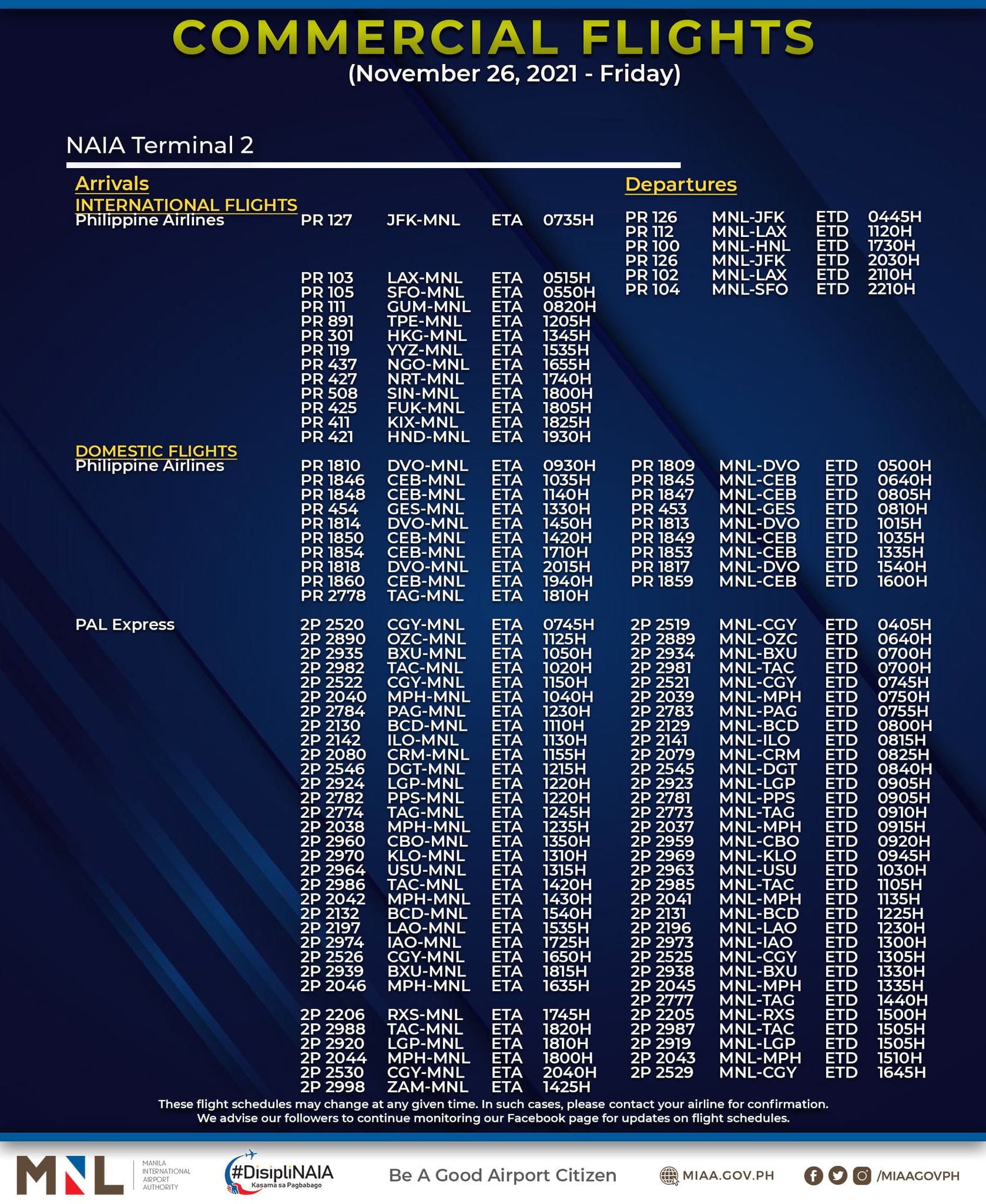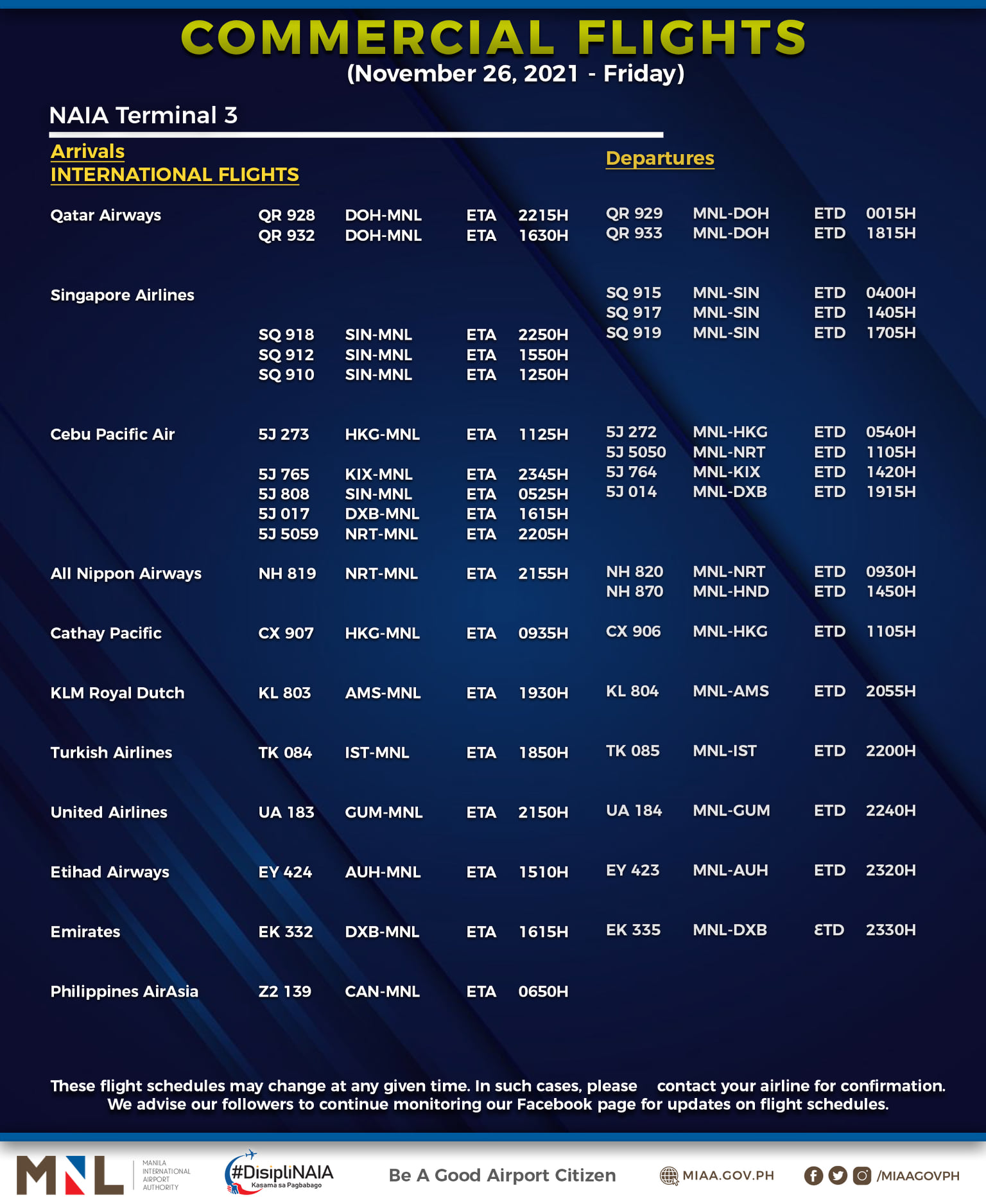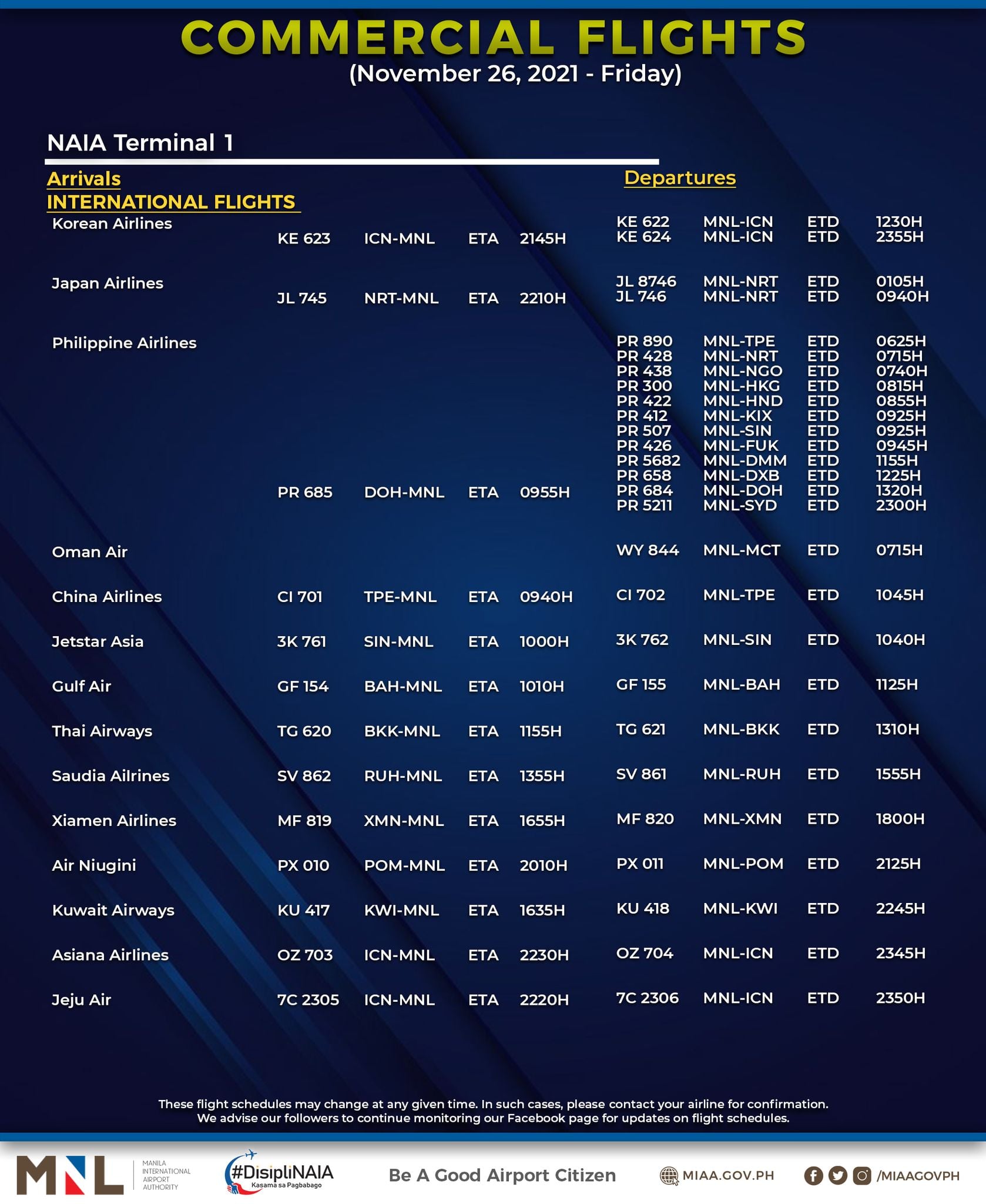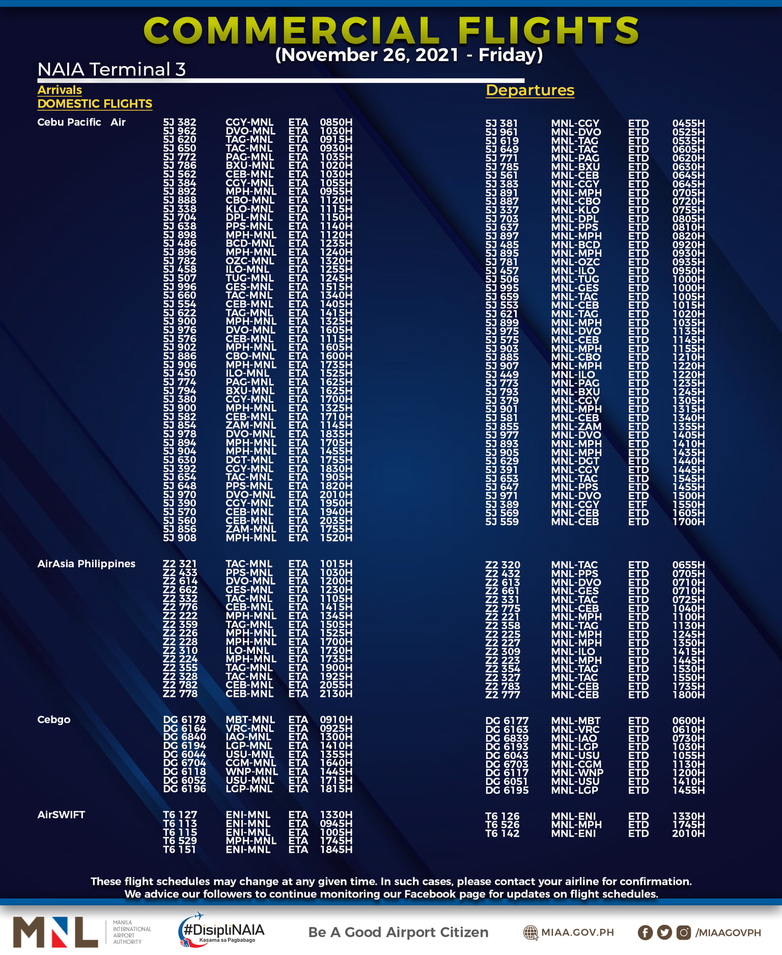 (Eagle News) — The Manila International Airport Authority has released its list of operational commercial flights for Friday, Nov. 26: