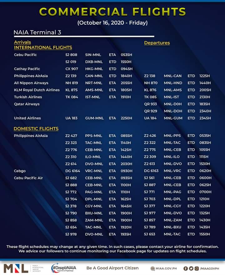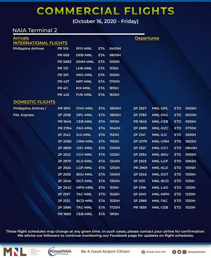 (Eagle News)–The Manila International Airport Authority has released its list of operational commercial flights for Friday, Oct. 16: