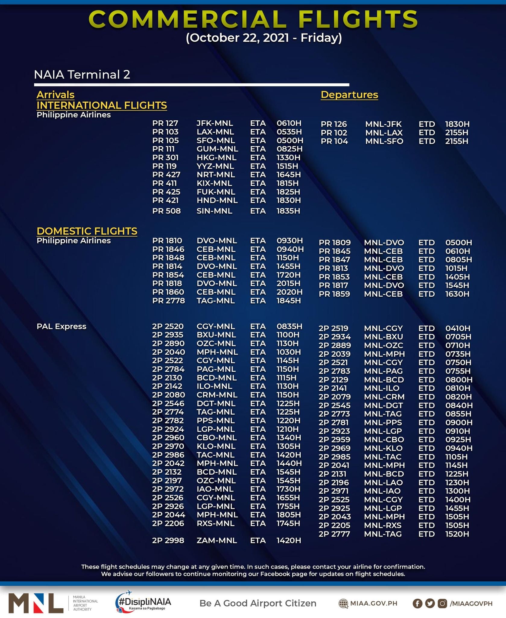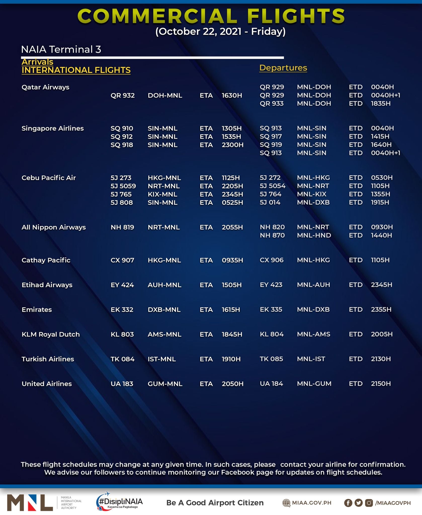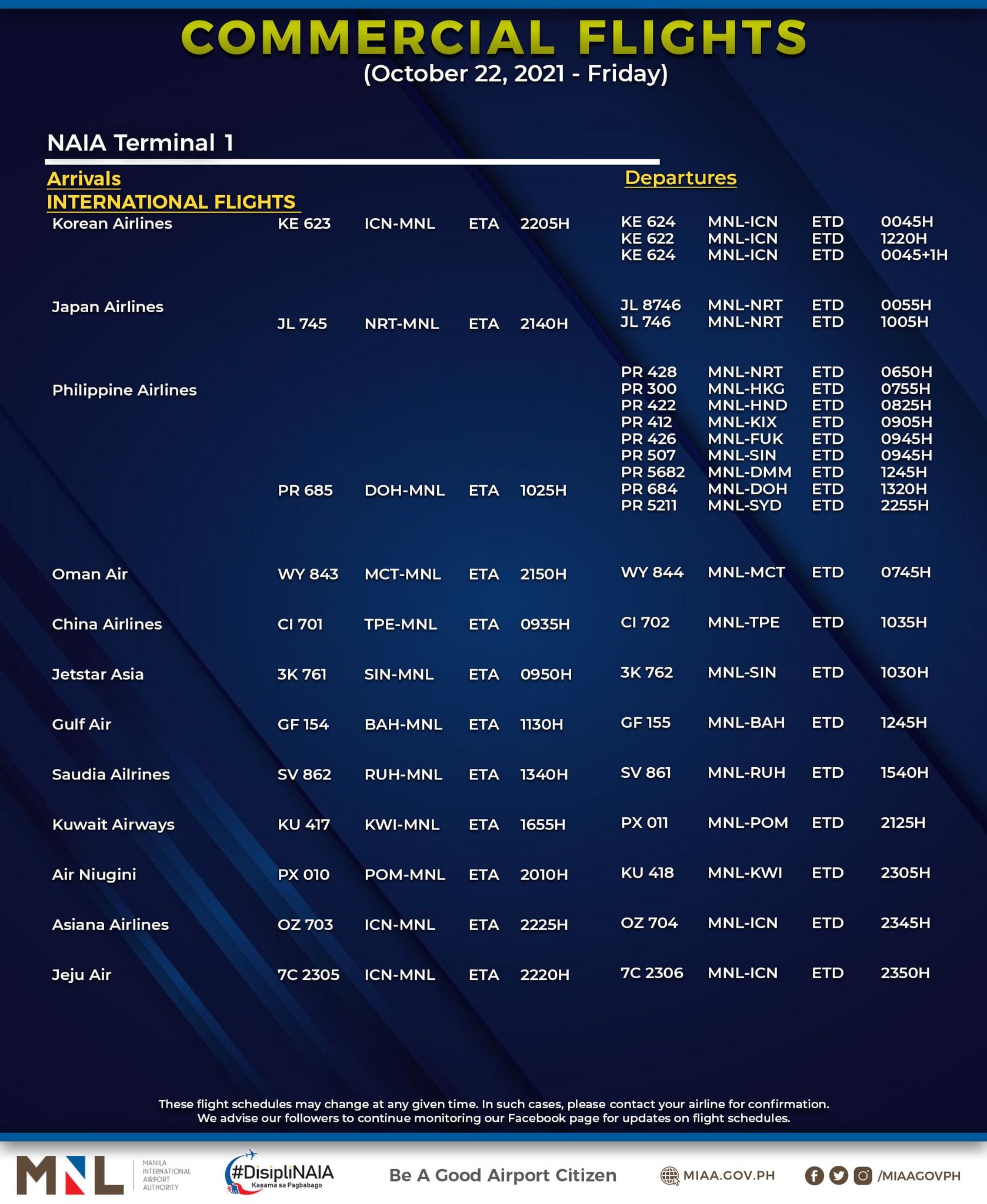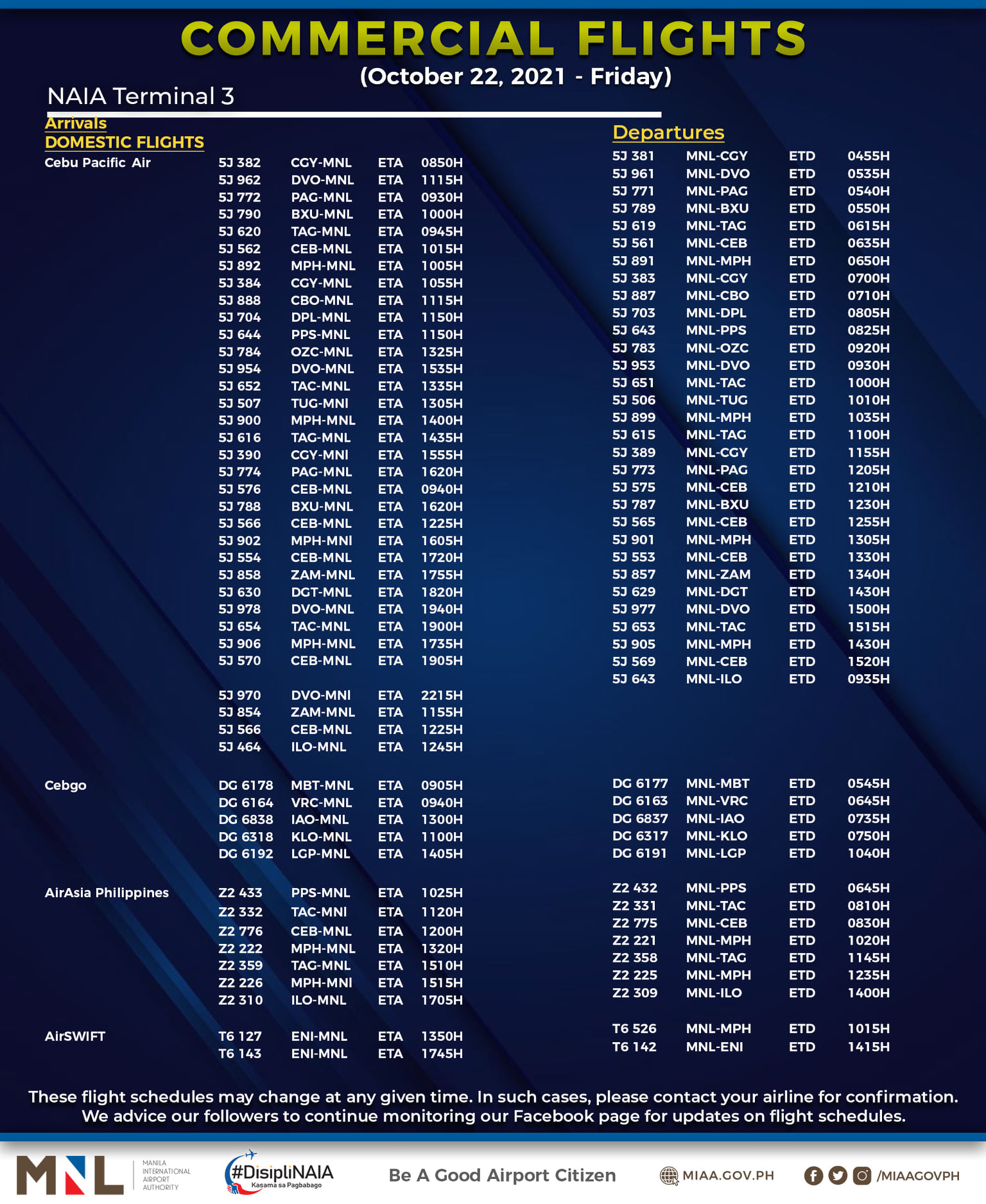 (Eagle News) — The Manila International Airport Authority has released its list of operational commercial flights for Friday, Oct. 22: