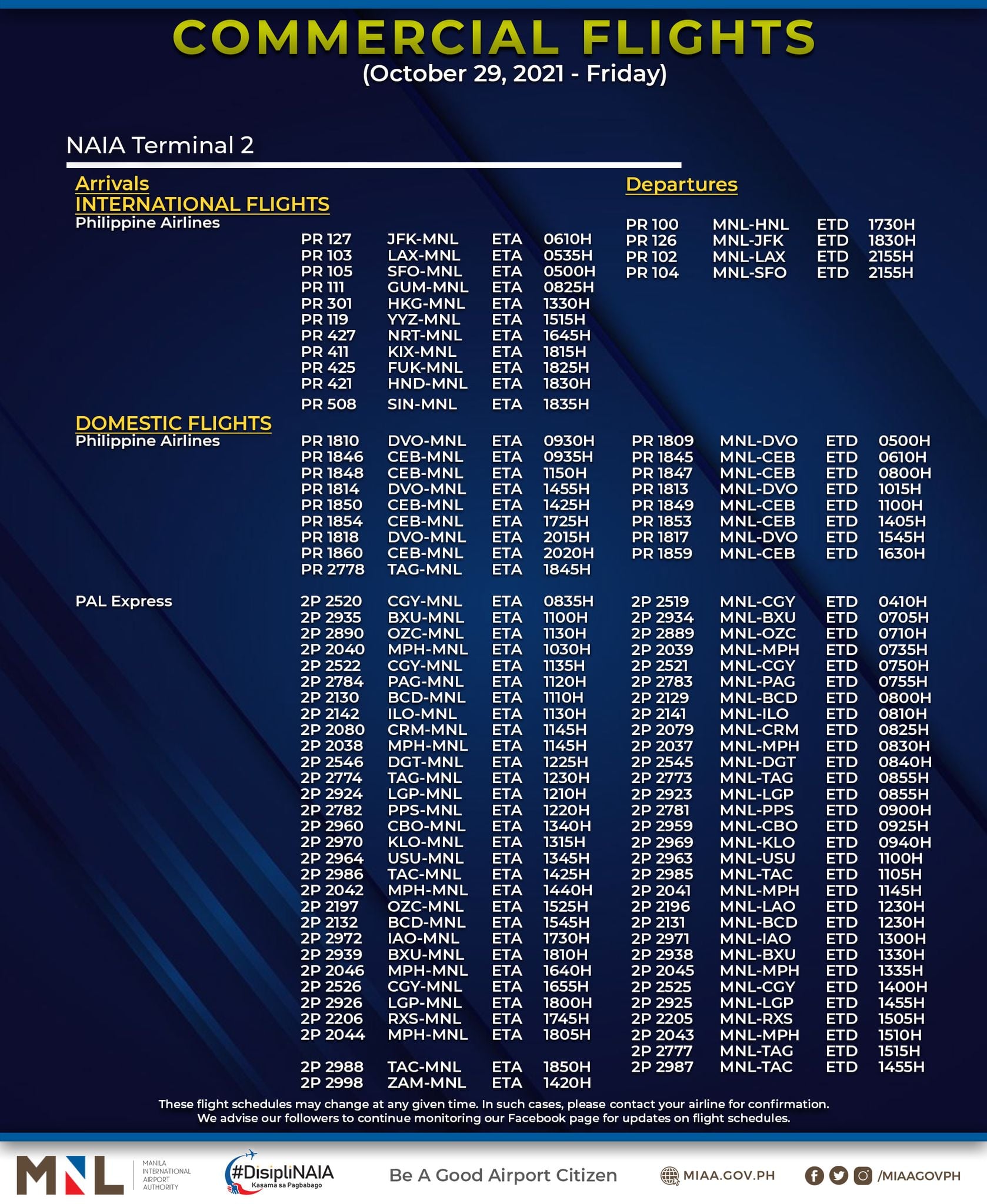 (Eagle News) — The Manila International Airport Authority has released its list of operational commercial flights for Friday, Oct. 29: