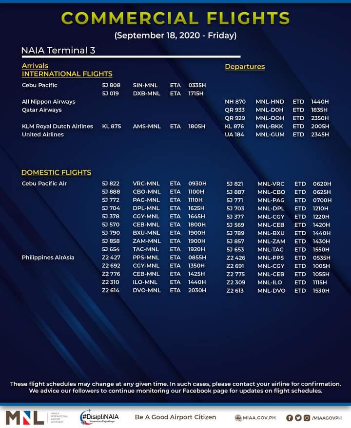 (Eagle News)–The Manila International Airport Authority has released its list of operational commercial flights for Friday, Sept. 18: