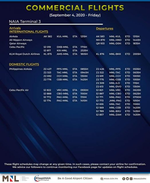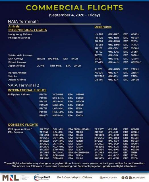 (Eagle News)–The Manila International Airport Authority has released its list of operational commercial flights for Friday, Sept. 4: