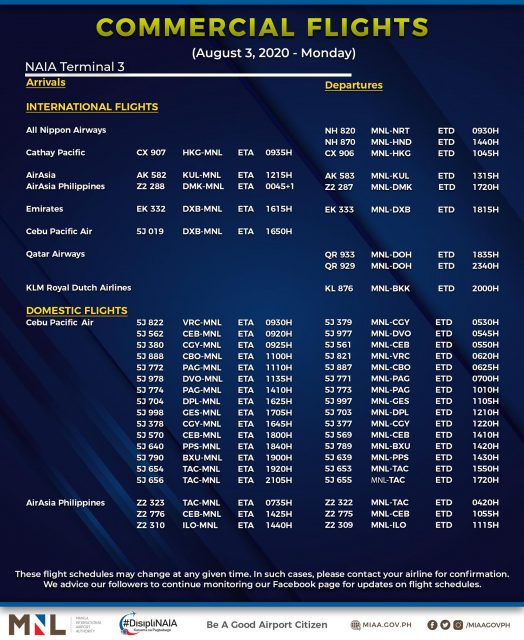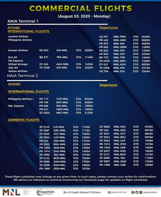 (Eagle News) — The Manila International Airport Authority has released its list of operational commercial flights for Monday, Aug. 3: