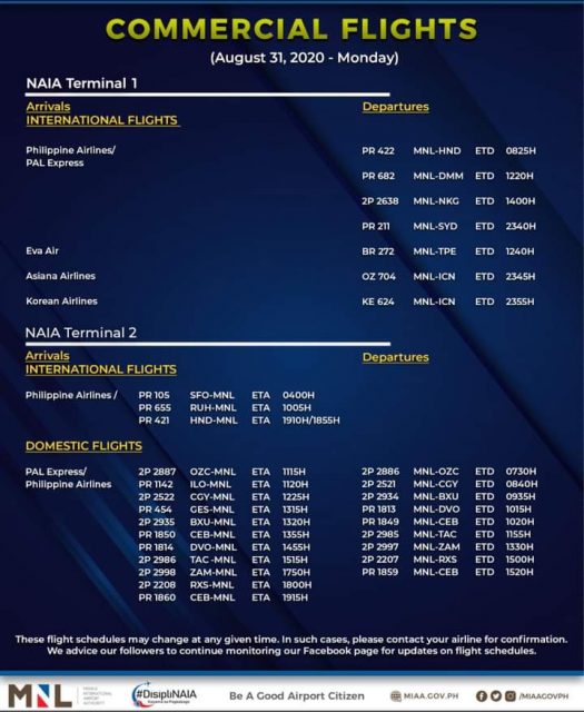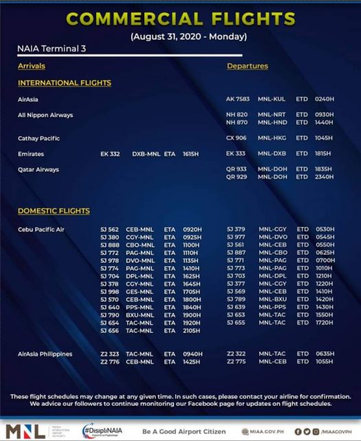 (Eagle News)–The Manila International Airport Authority has released its list of operational commercial flights for Monday, Aug. 31: