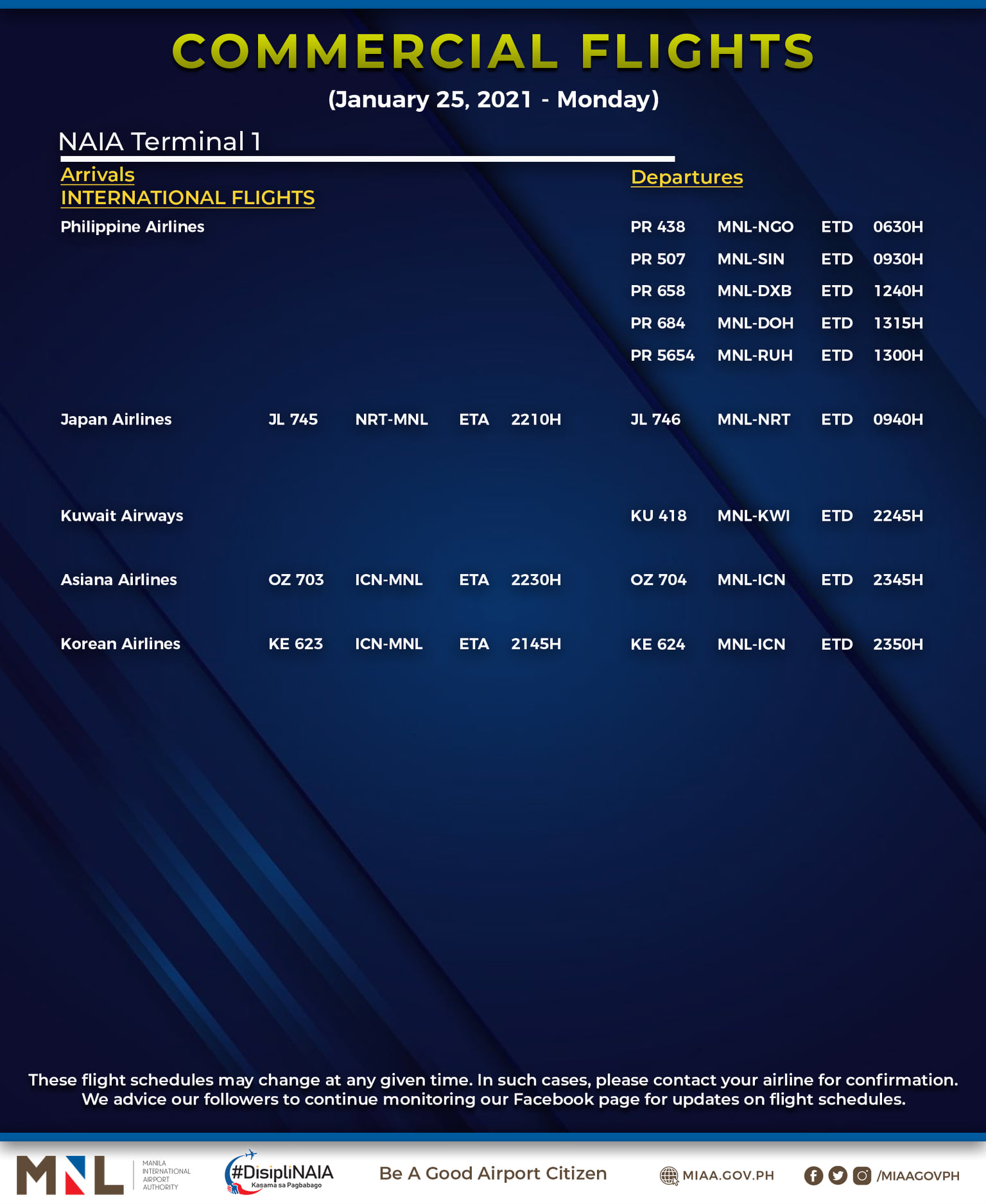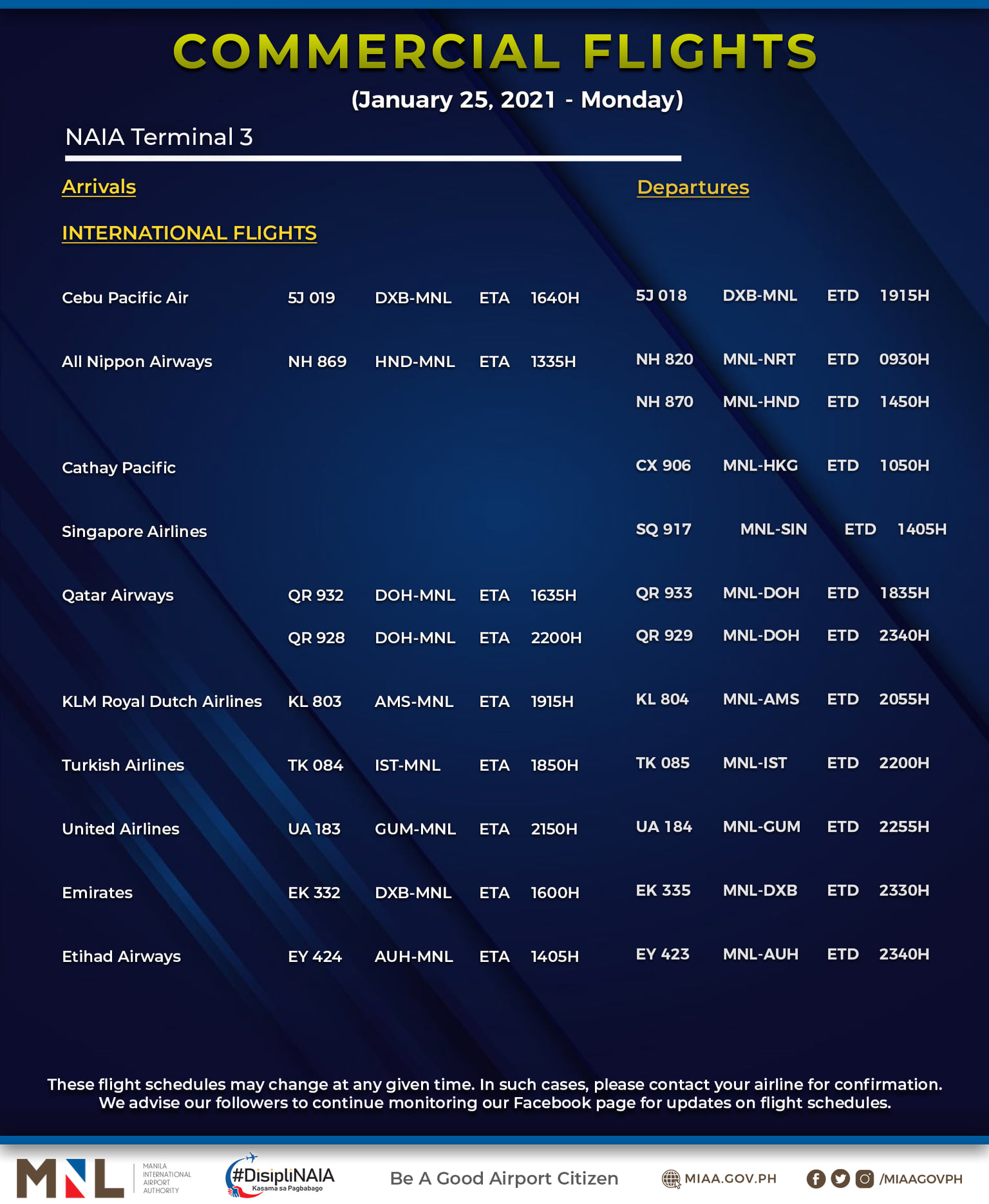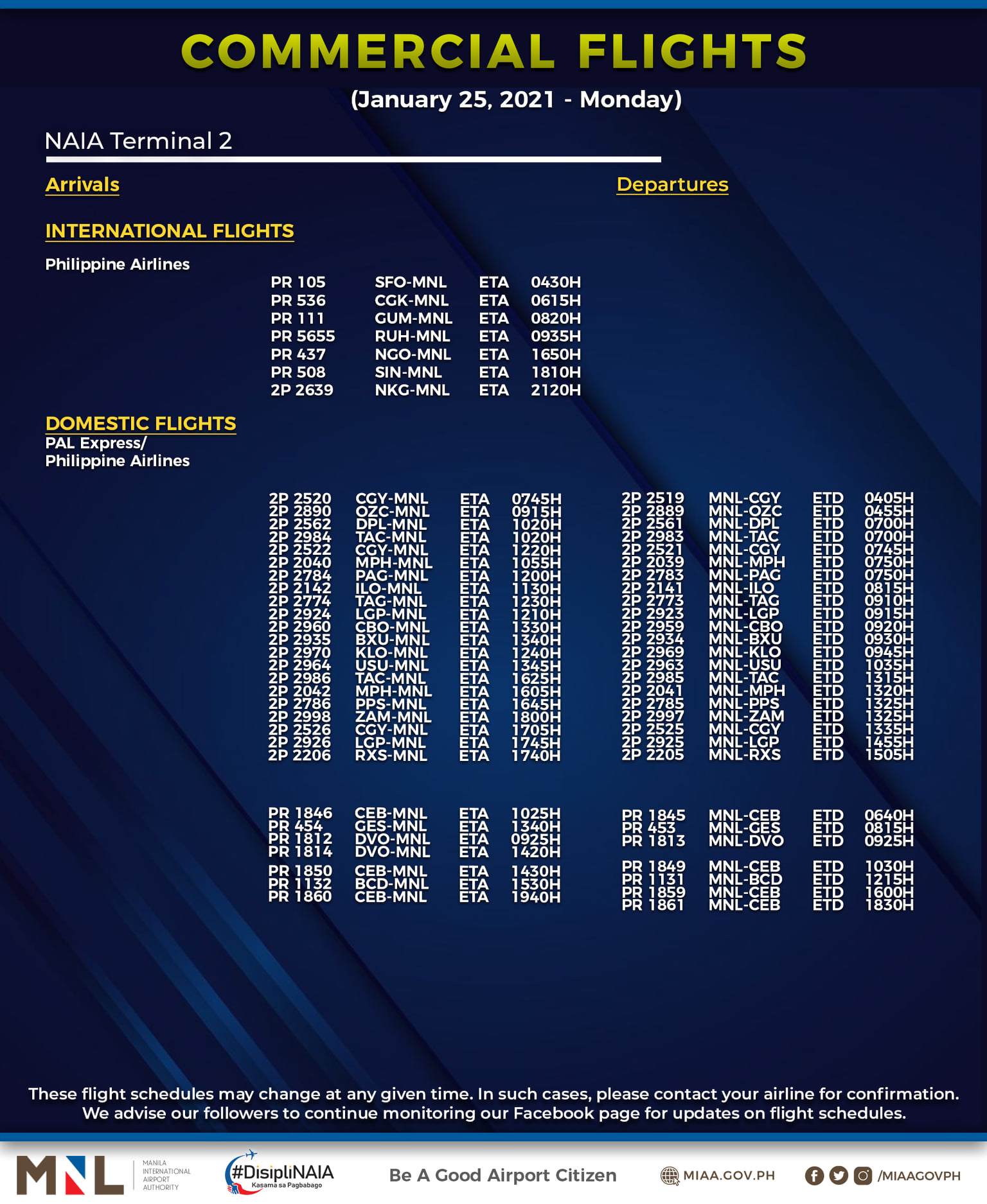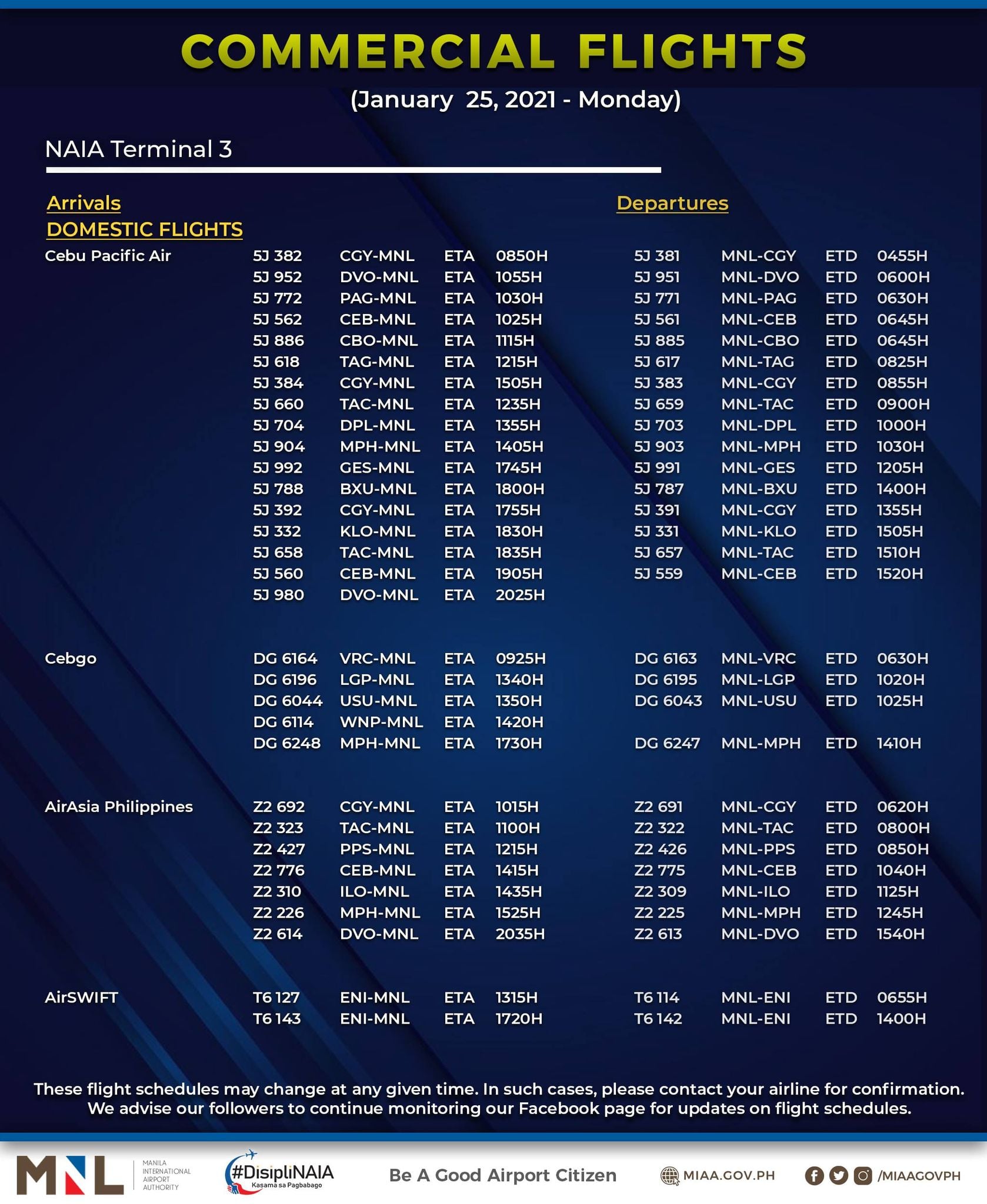 (Eagle News) — The Manila International Airport Authority has released its list of operational commercial flights for Monday, Jan. 25: