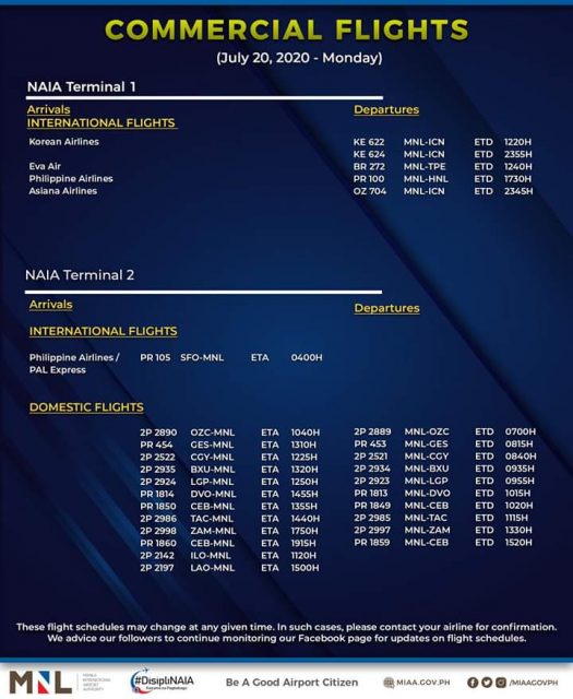 (Eagle News)–The Manila International Airport Authority has released its list of operational commercial flights for Monday, July 20: