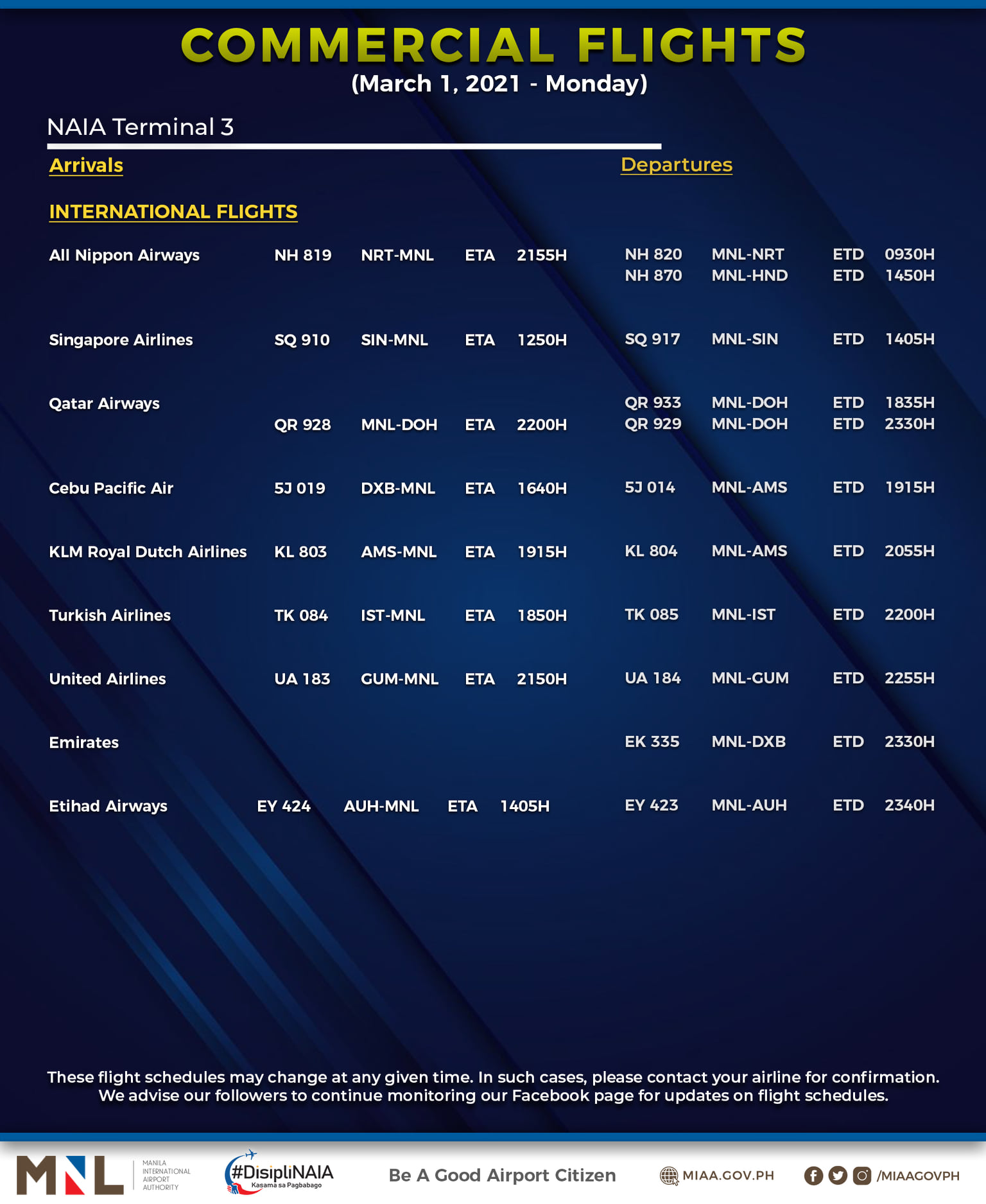 (Eagle News) — The Manila International Airport Authority has released its list of operational commercial flights for Monday, March 1: