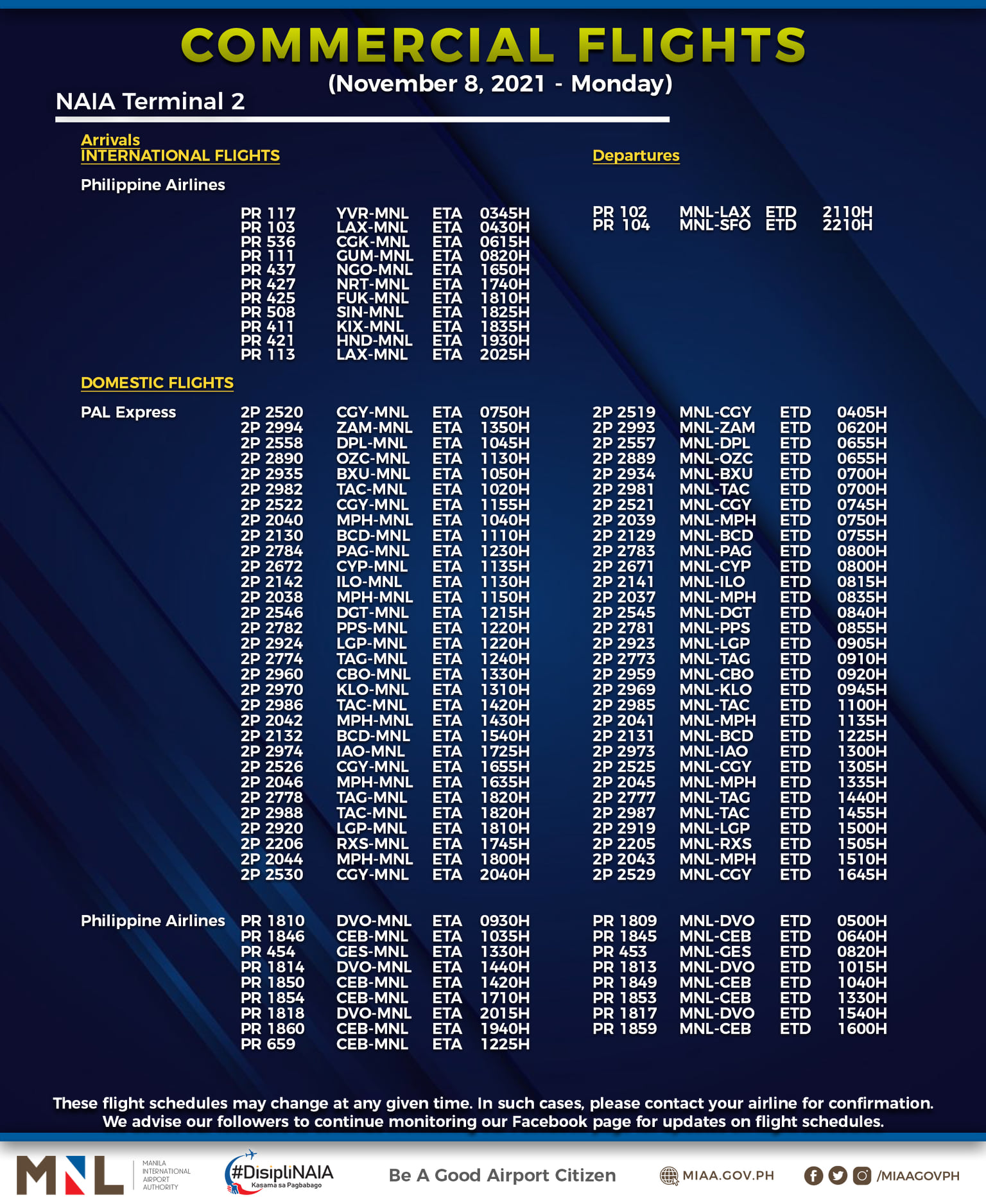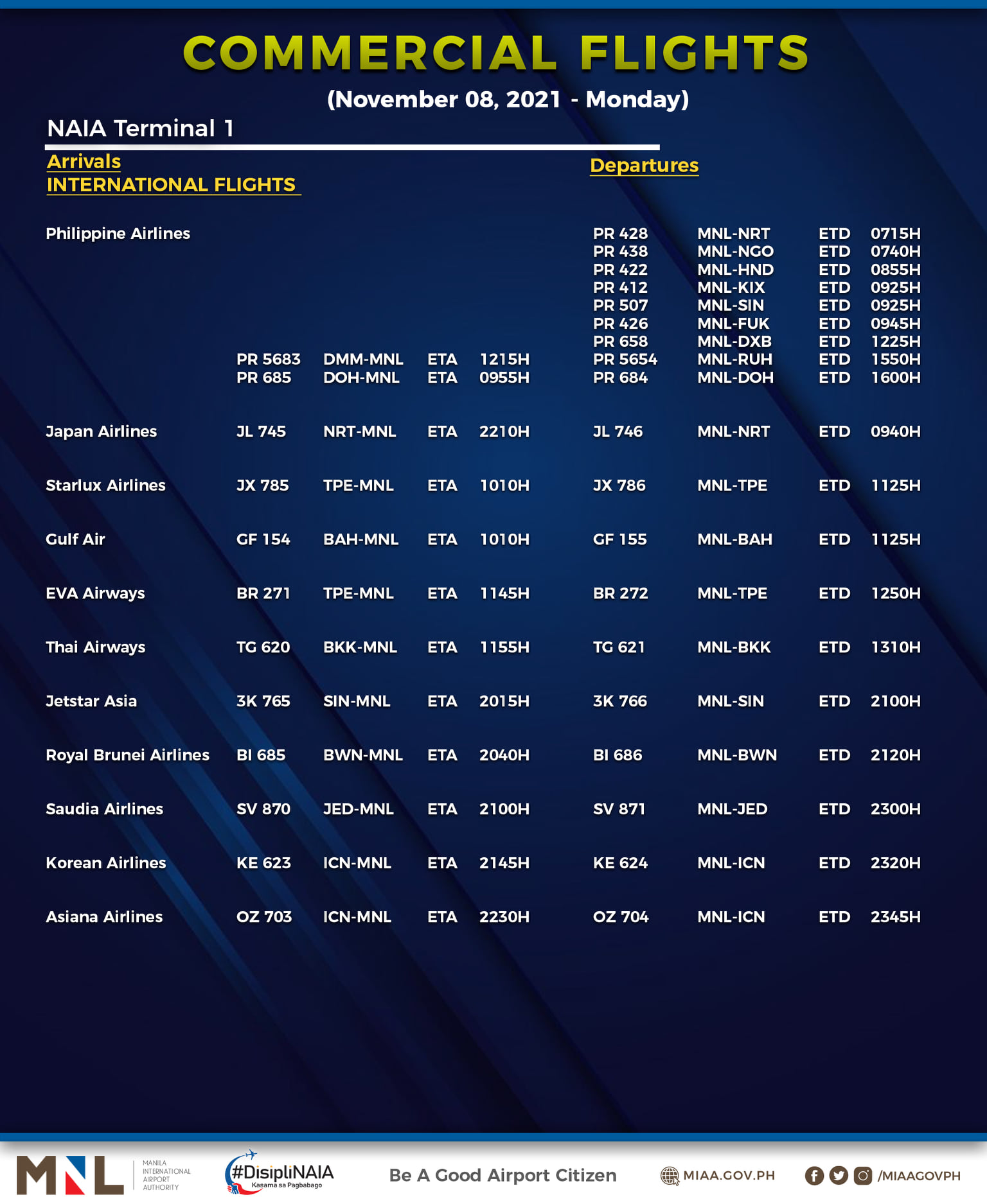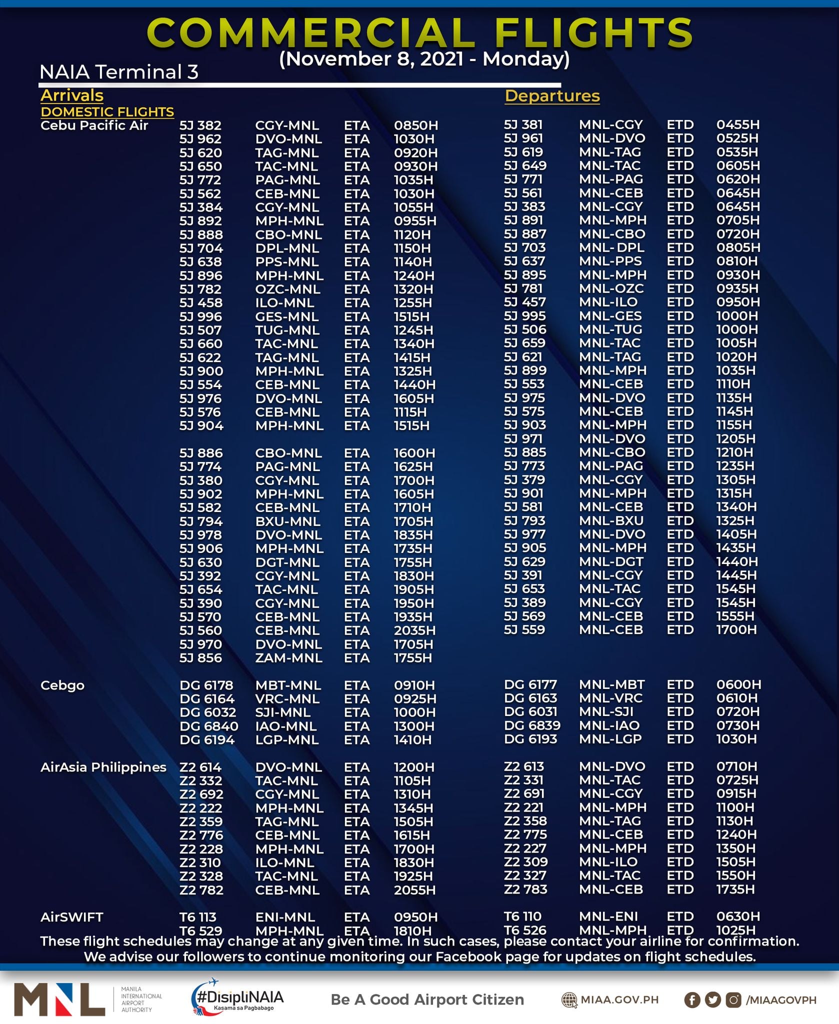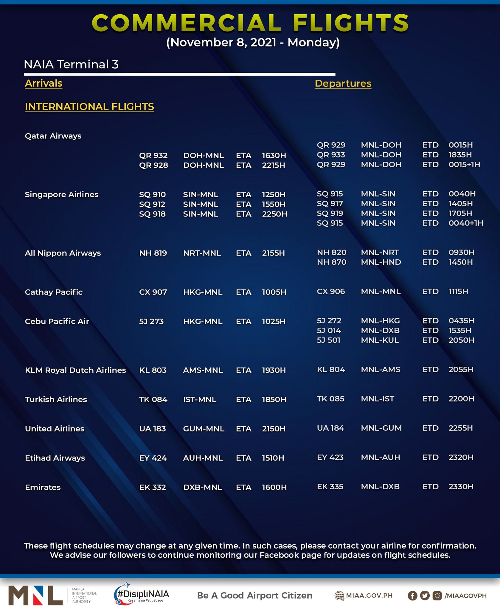 (Eagle News) — The Manila International Airport Authority has released its list of operational commercial flights for Monday, Nov. 8: