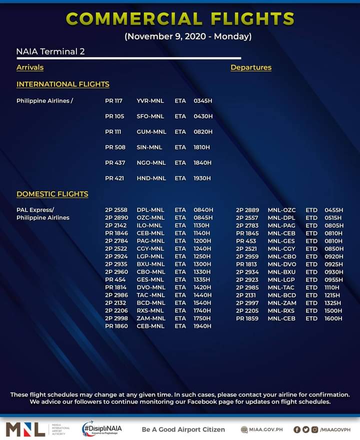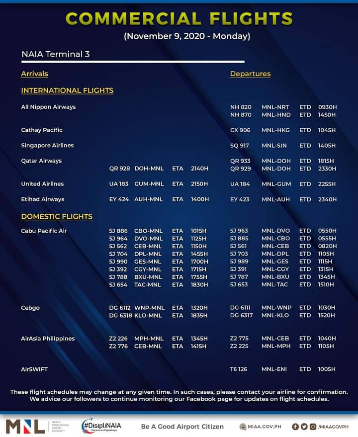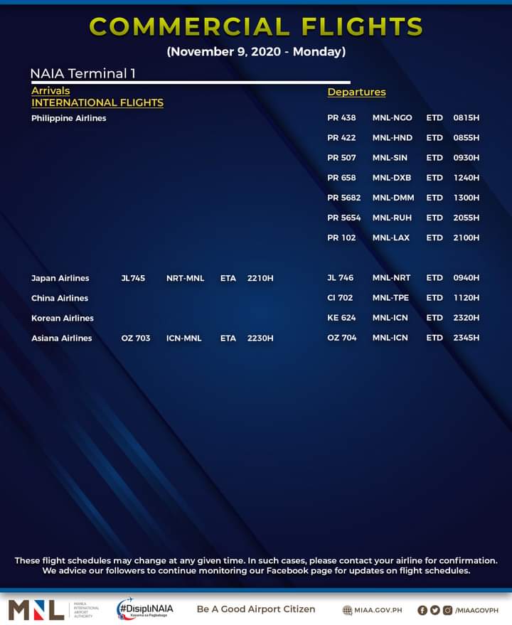 (Eagle News)–The Manila International Airport has released its list of operational commercial flights for Monday, Nov. 9: