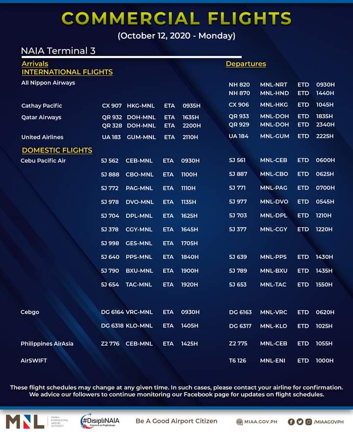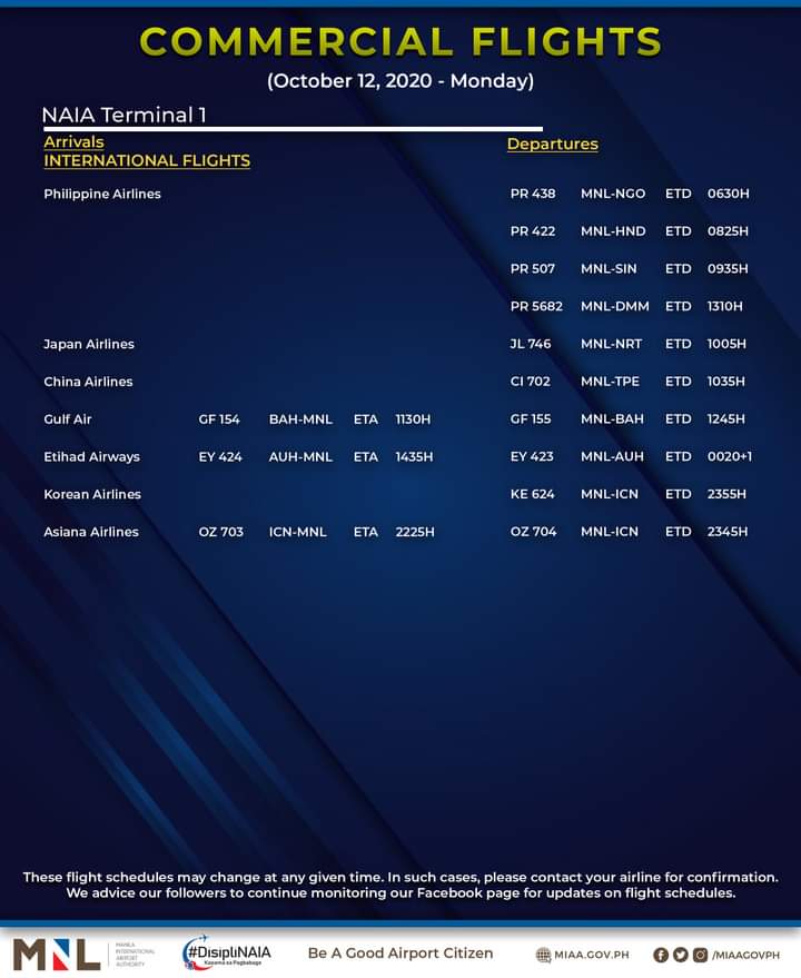 (Eagle News)–The Manila International Airport Authority has released its list of operational commercial flights for Monday, Oct. 12: