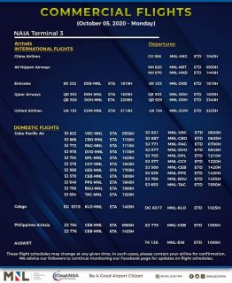 (Eagle News)–The Manila International Airport Authority has released its list of operational commercial flights for Monday, Oct. 5: