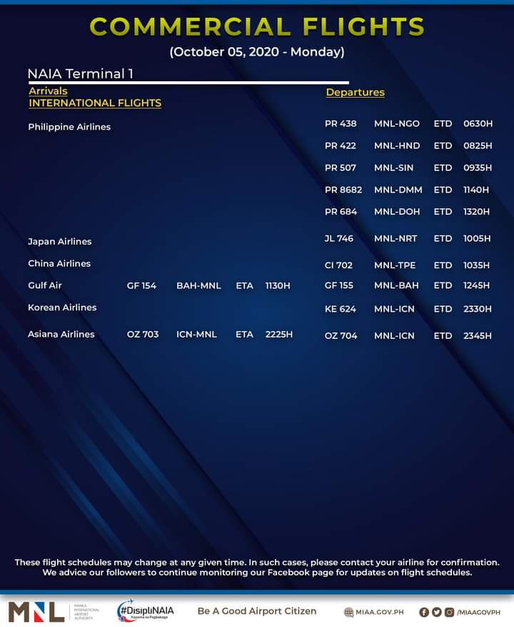 (Eagle News)–The Manila International Airport Authority has released its list of operational commercial flights for Monday, Oct. 5: