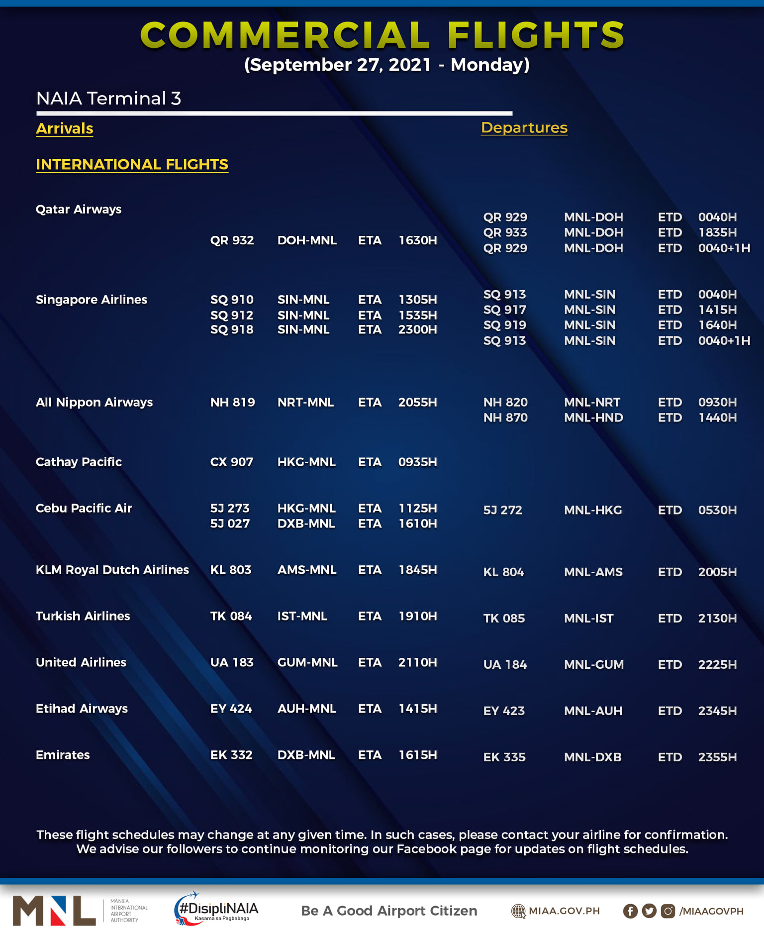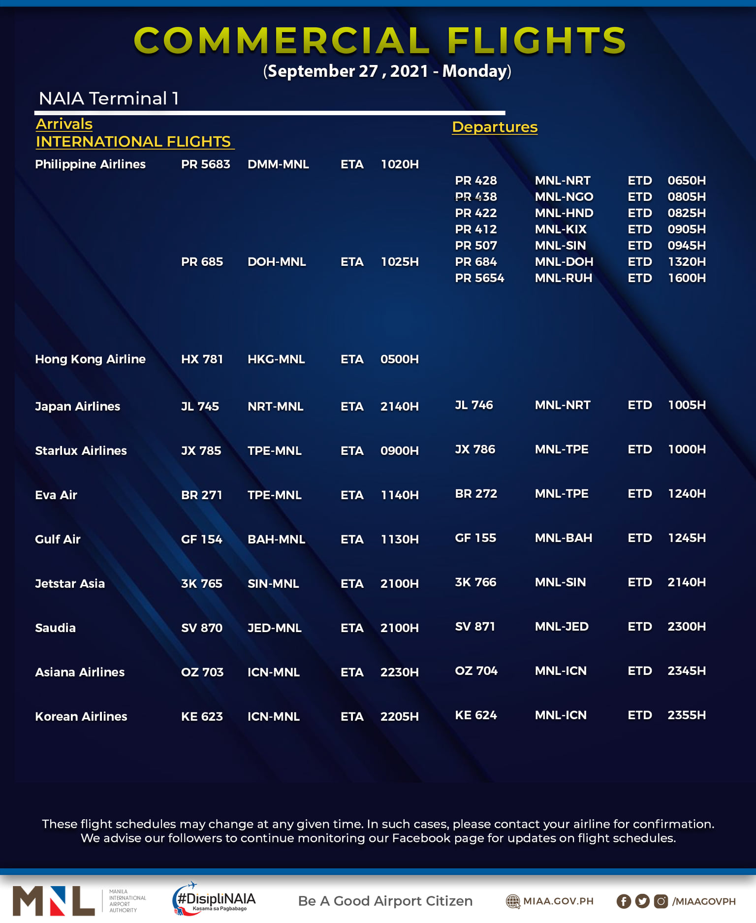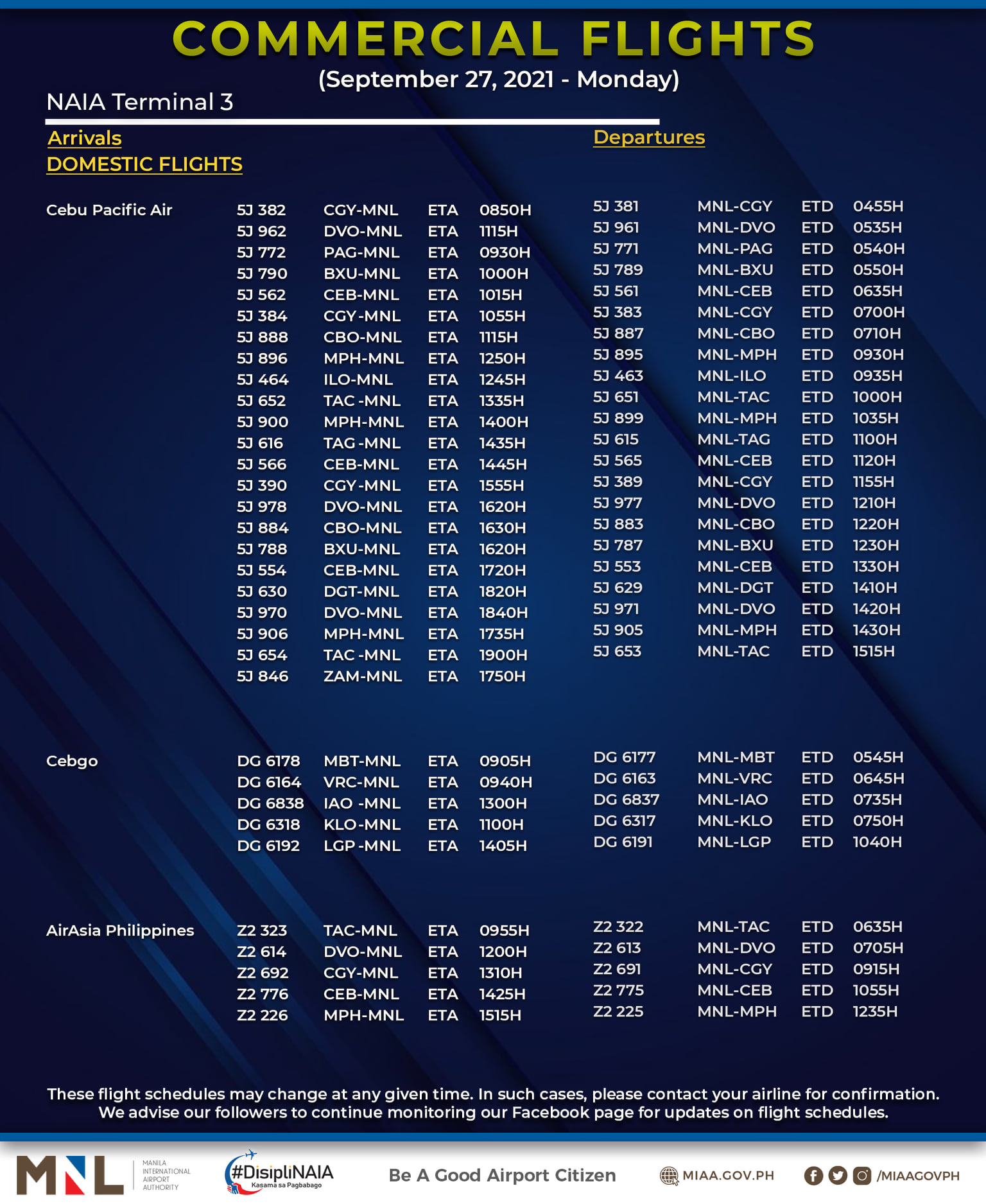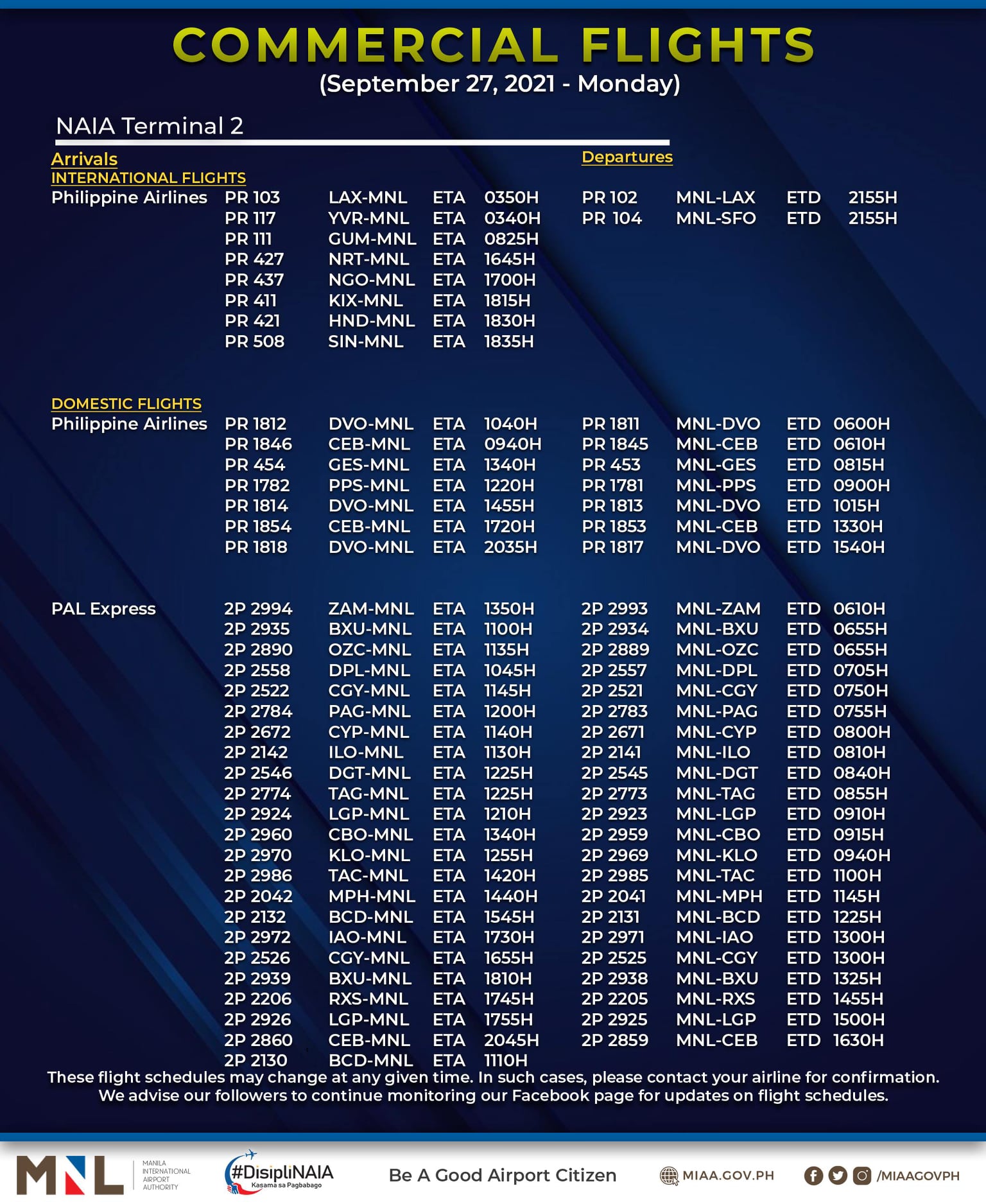(Eagle News) — The Manila International Airport Authority has released its list of operational commercial flights for Monday, Sept. 27: