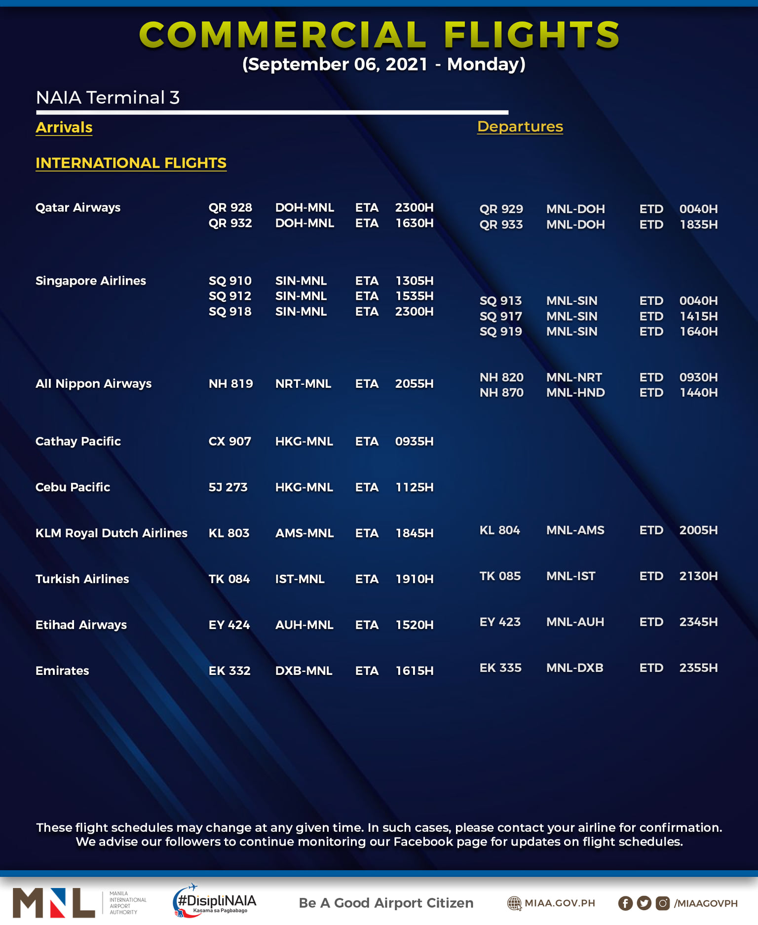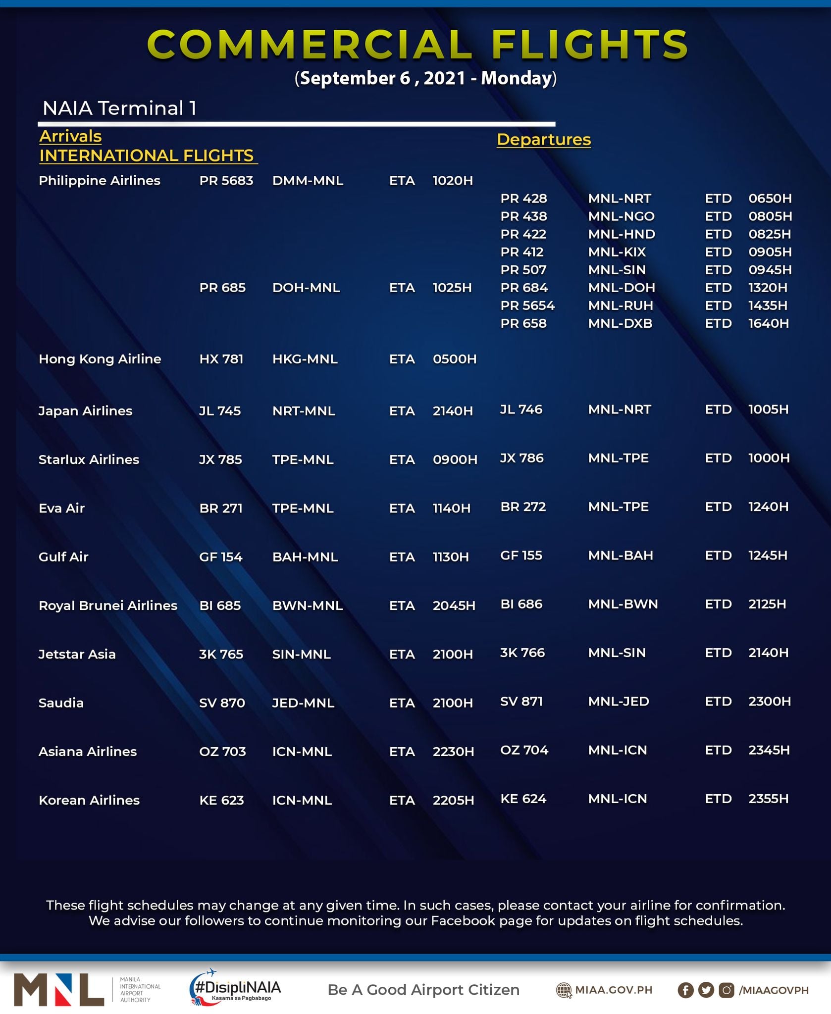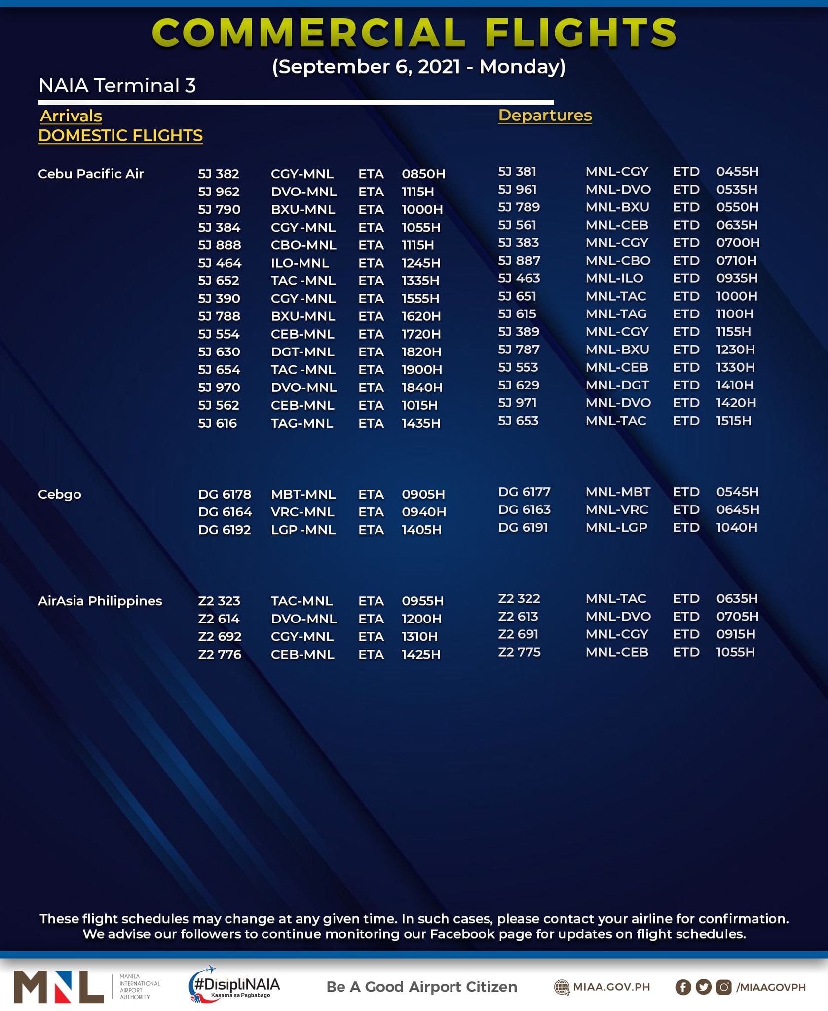 (Eagle News) — The Manila International Airport Authority has released its list of operational commercial flights for Monday, Sept. 6: