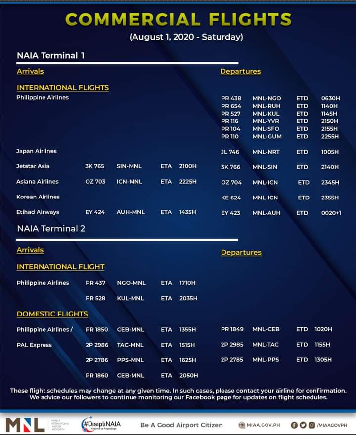(Eagle News)–The Manila International Airport Authority has released its list of operational commercial flights for Saturday, Aug. 1: