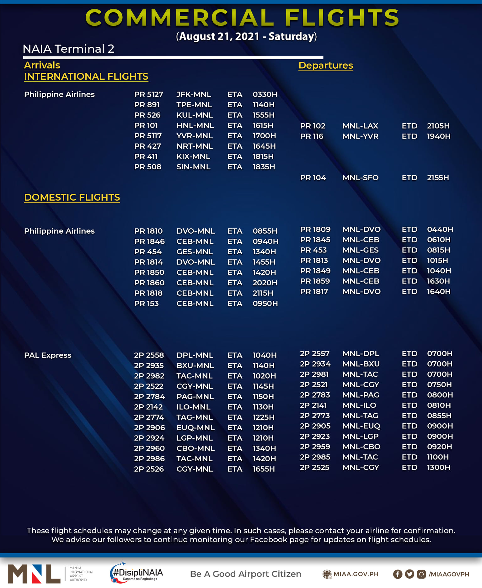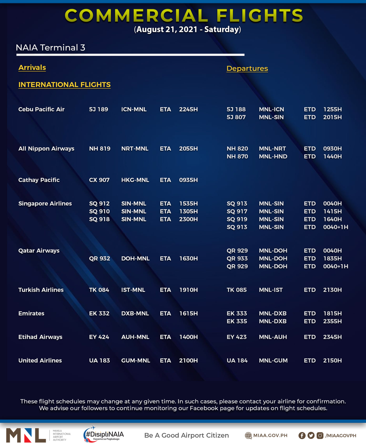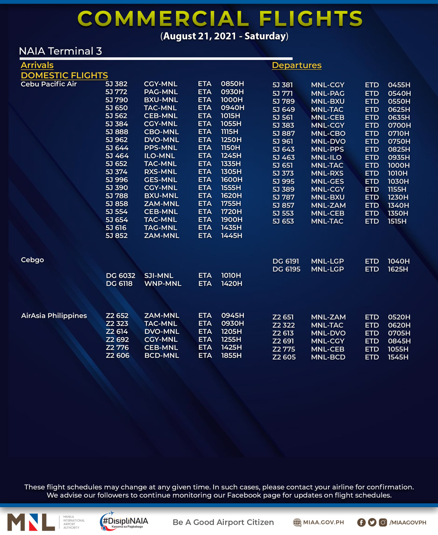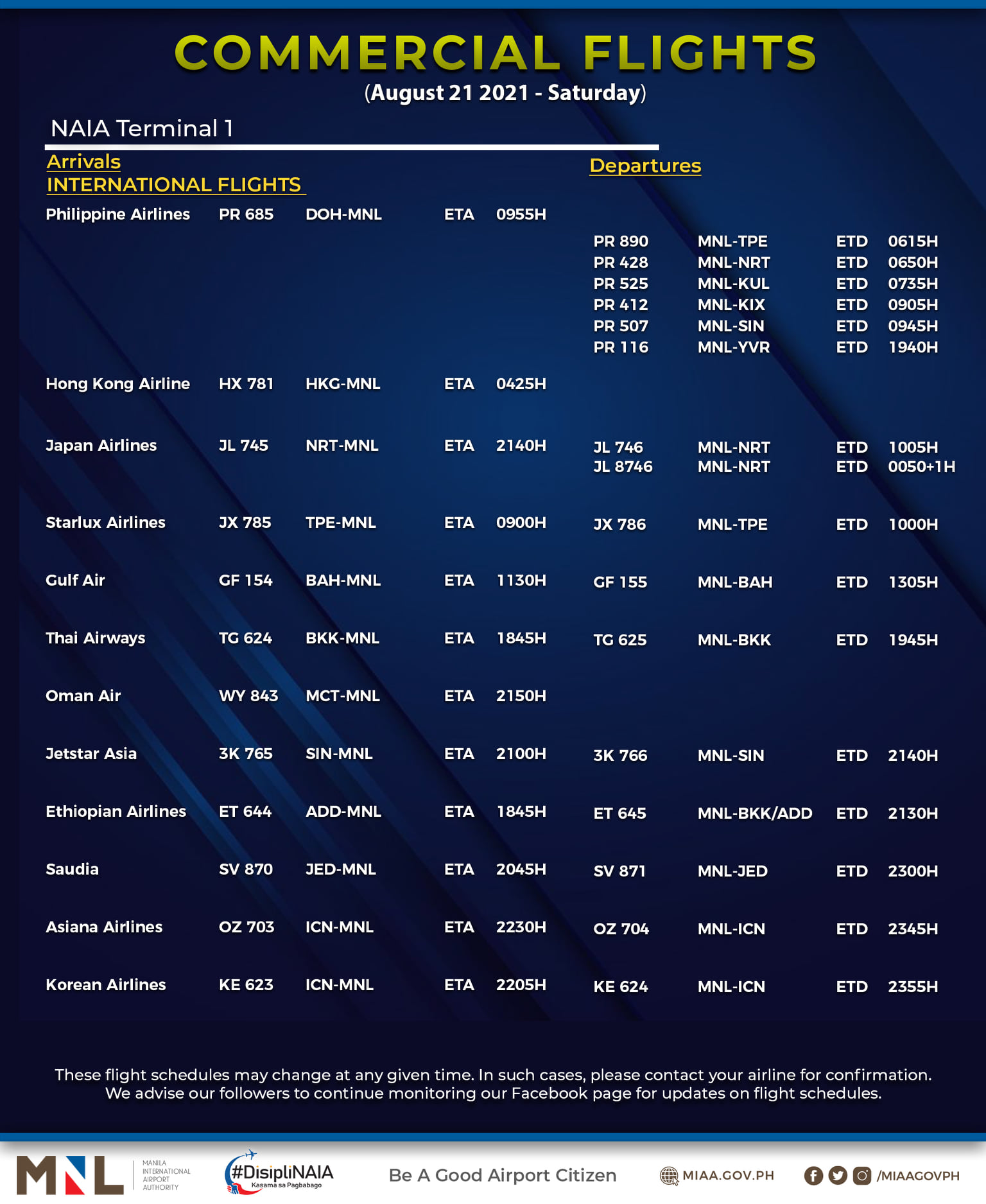 (Eagle News) — The Manila International Airport Authority has released its list of operational commercial flights for Saturday, Aug. 21: