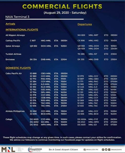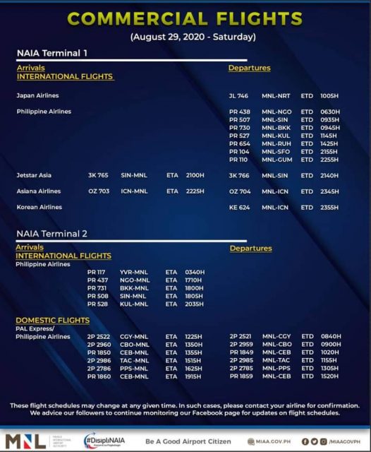 (Eagle News)–The Manila International Airport Authority has released its list of operational commercial flights for Saturday, Aug. 29: