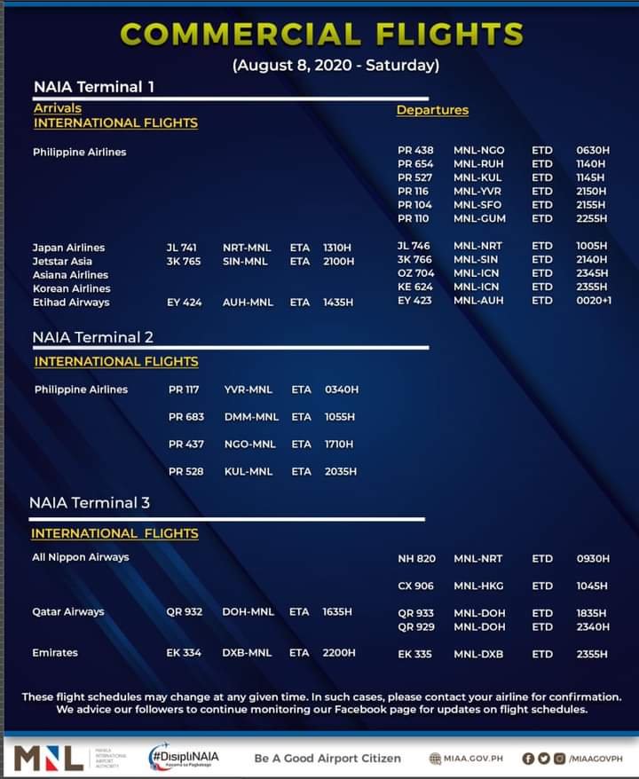 (Eagle News)–The Manila International Airport Authority has released its list of operational commercial flights for Saturday, Aug. 8: