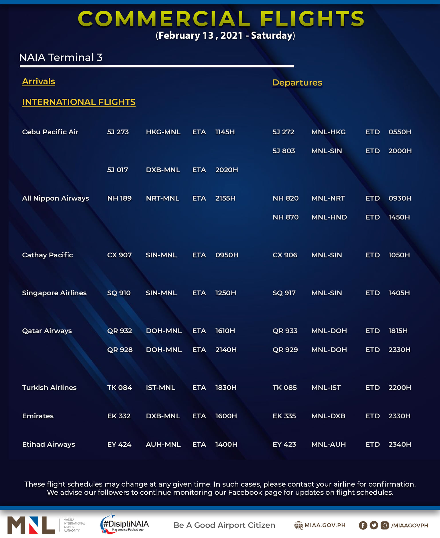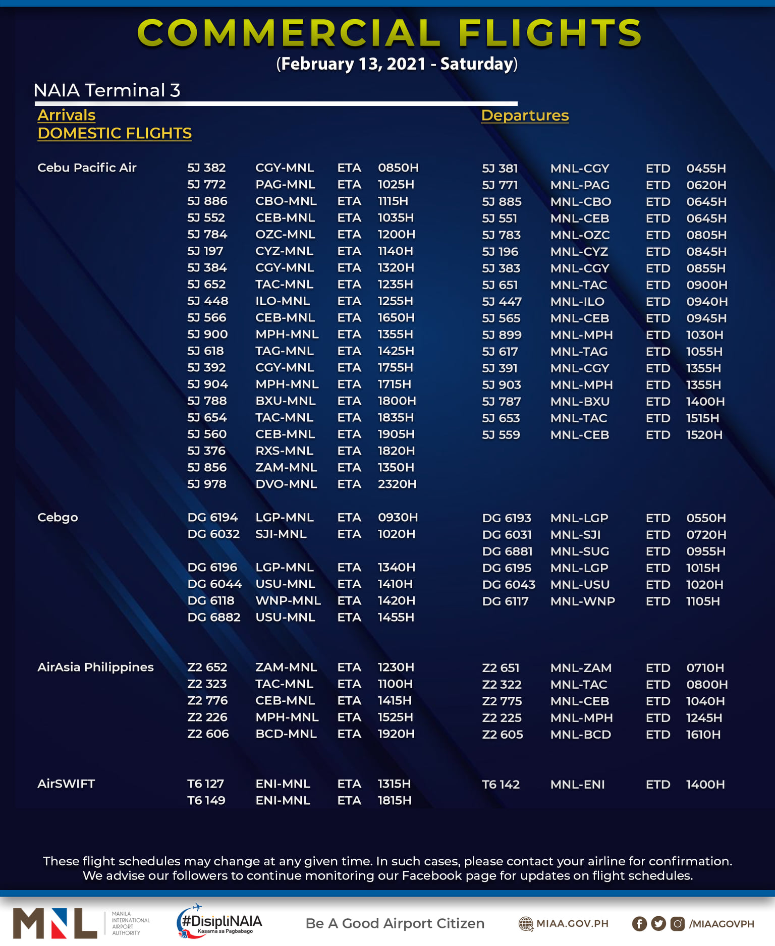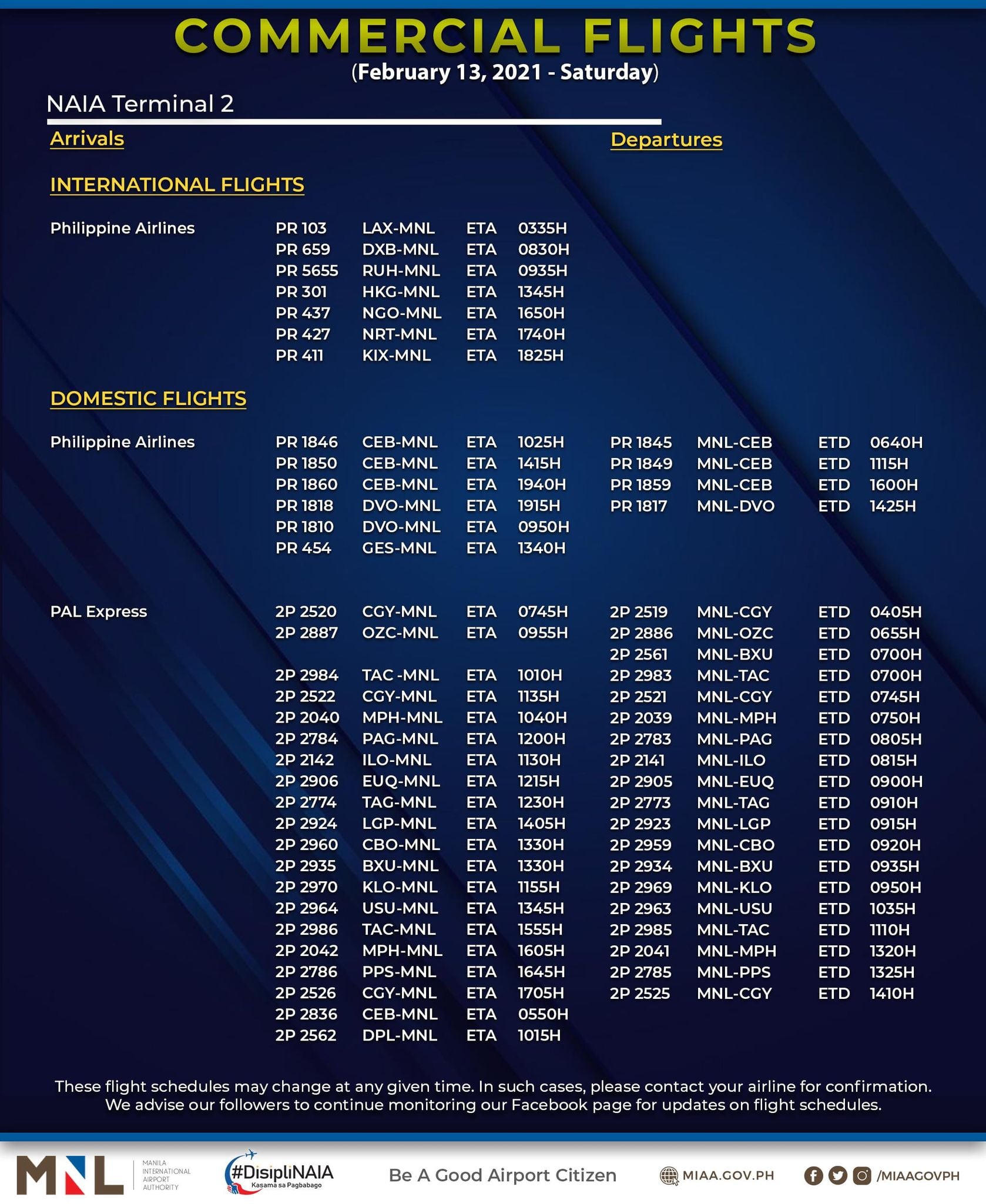 (Eagle News) — The Manila International Airport Authority has released its list of operational commercial flights for Saturday, Feb. 13: