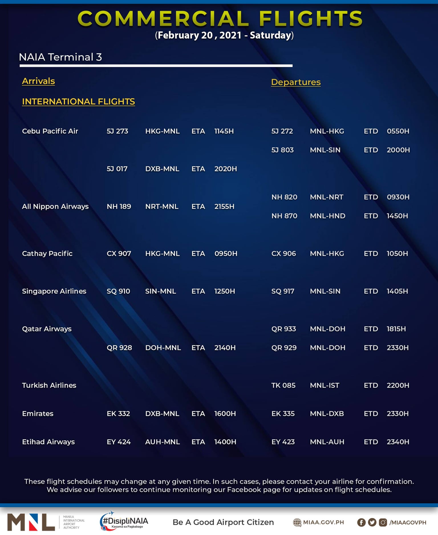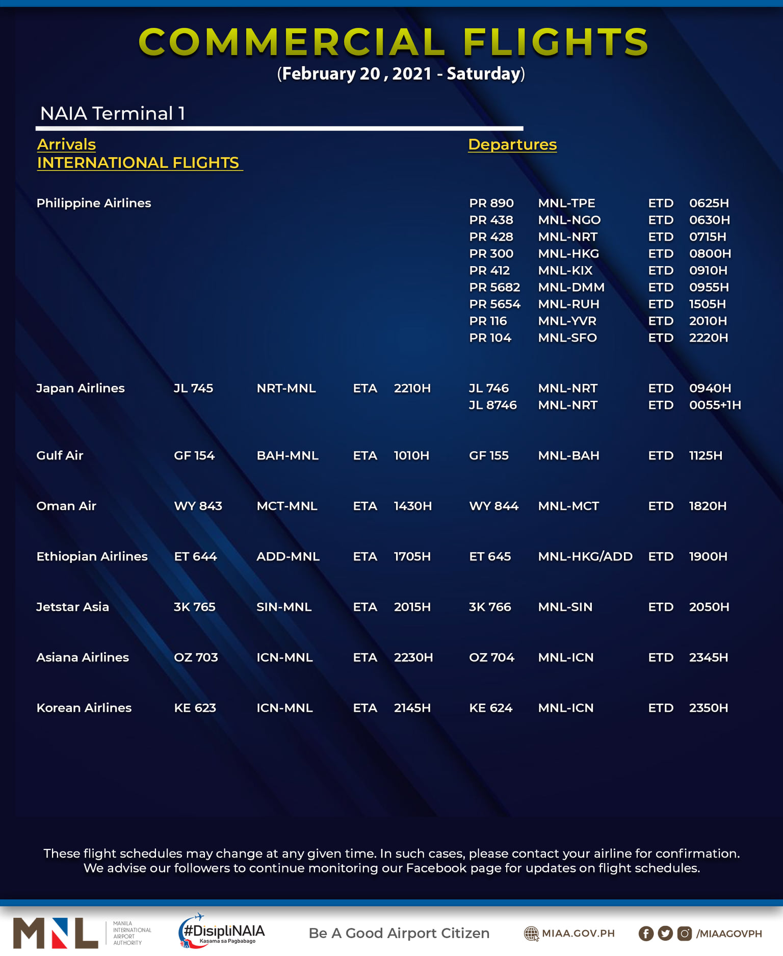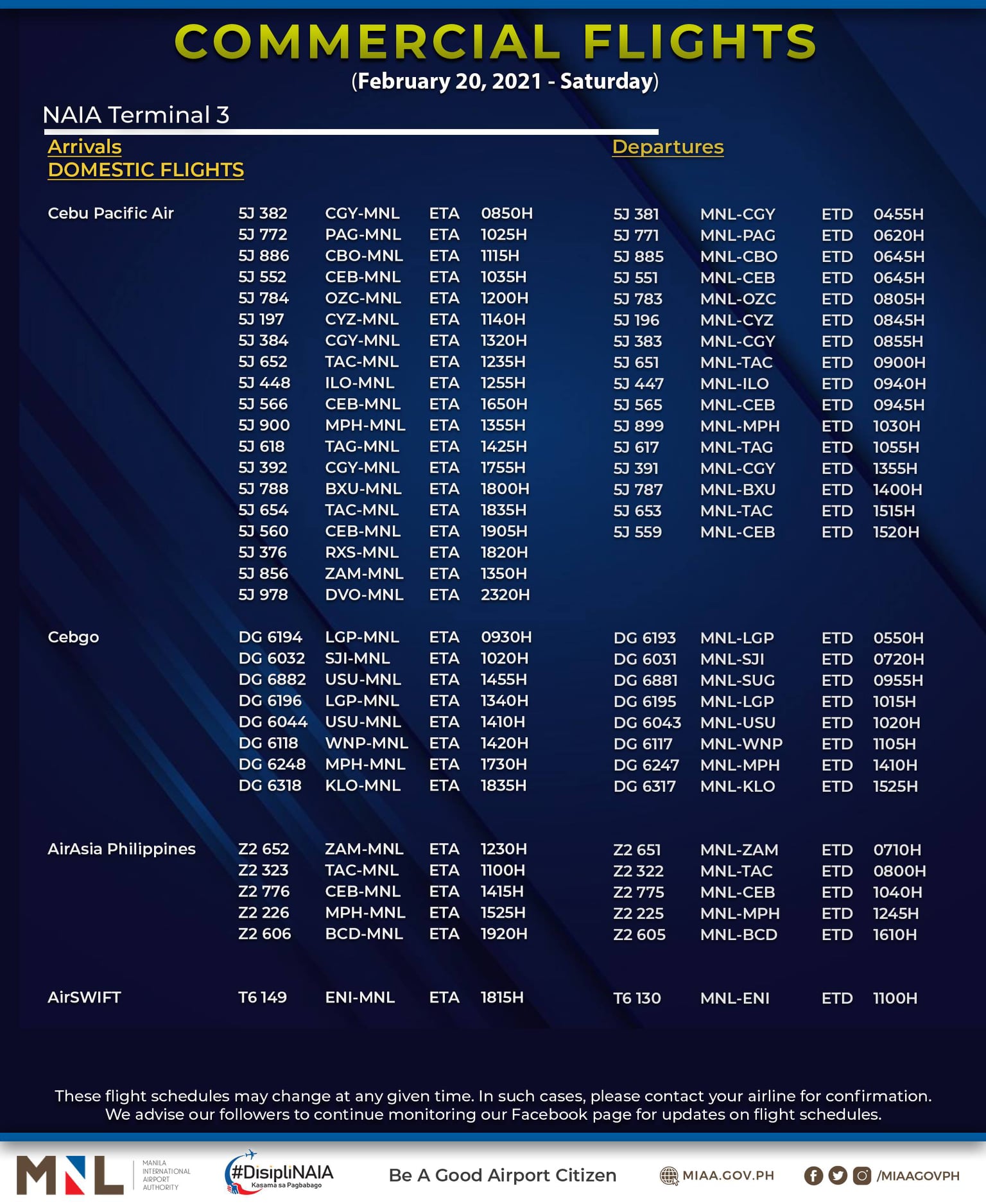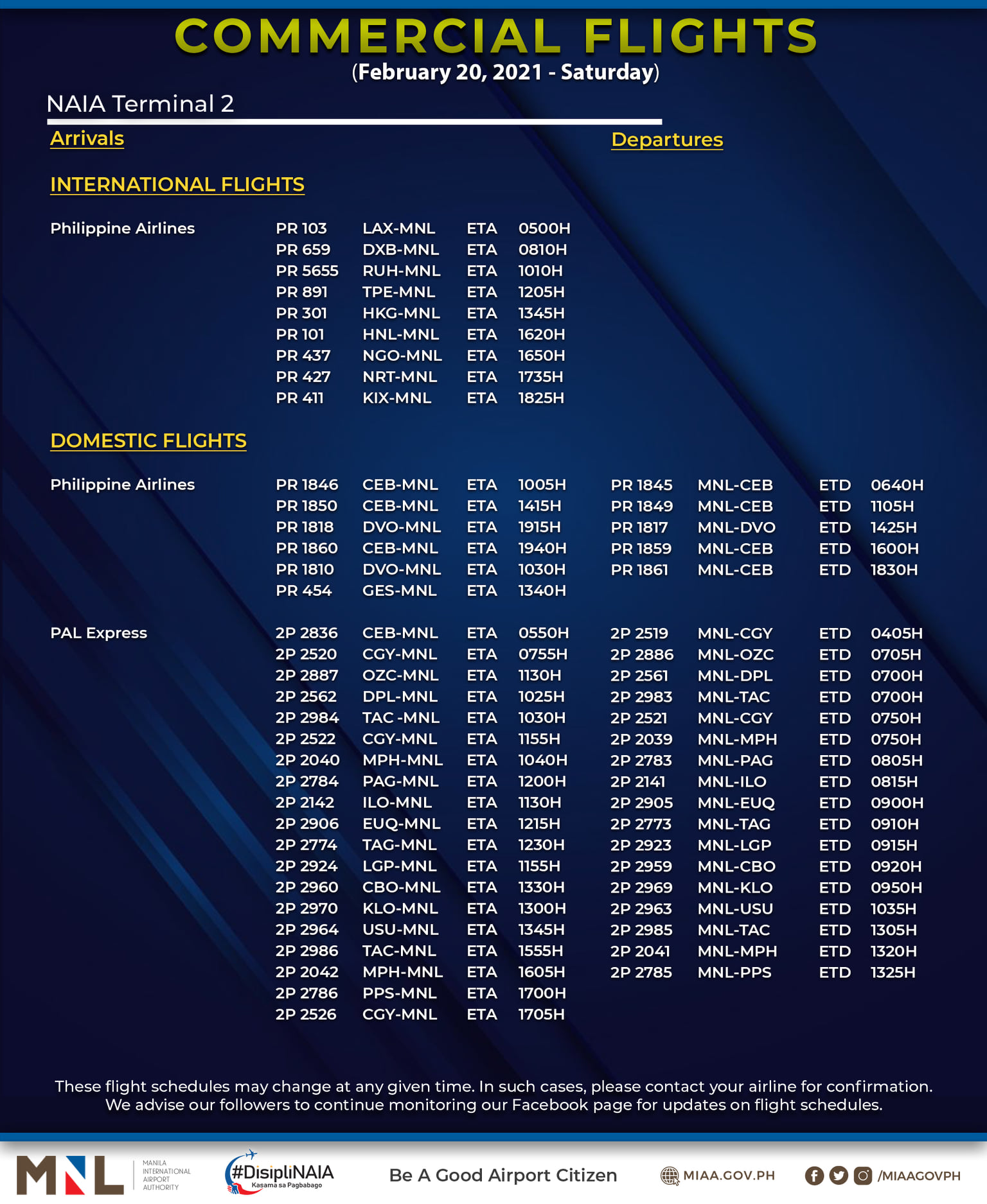 (Eagle News) — The Manila International Airport Authority has released its list of operational commercial flights for Saturday, Feb. 20:
