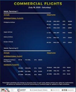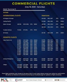 (Eagle News)–The Manila International Airport Authority has released its list of operational commercial flights for Saturday, July 18: