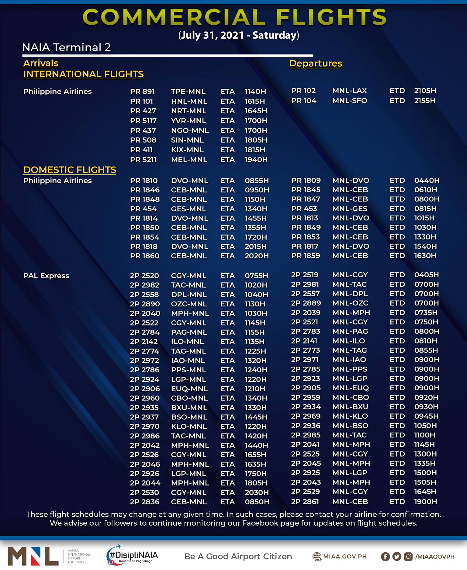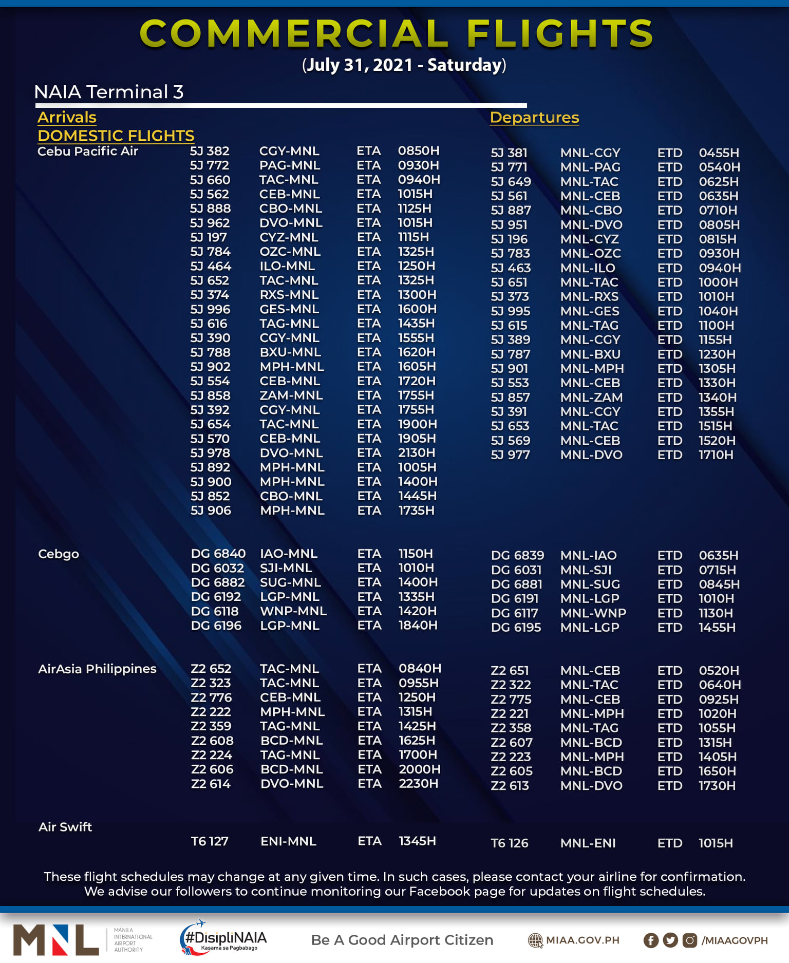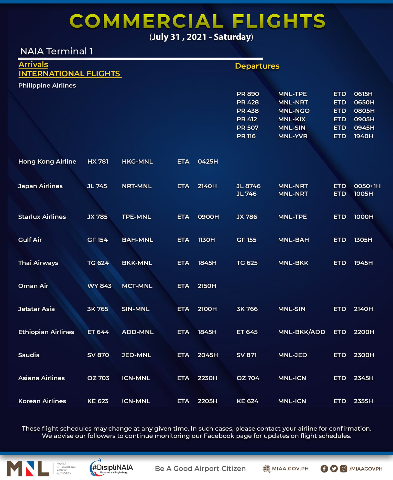 (Eagle News)– The Manila International Airport Authority has released its list of operational commercial flights for Saturday, July 31:
