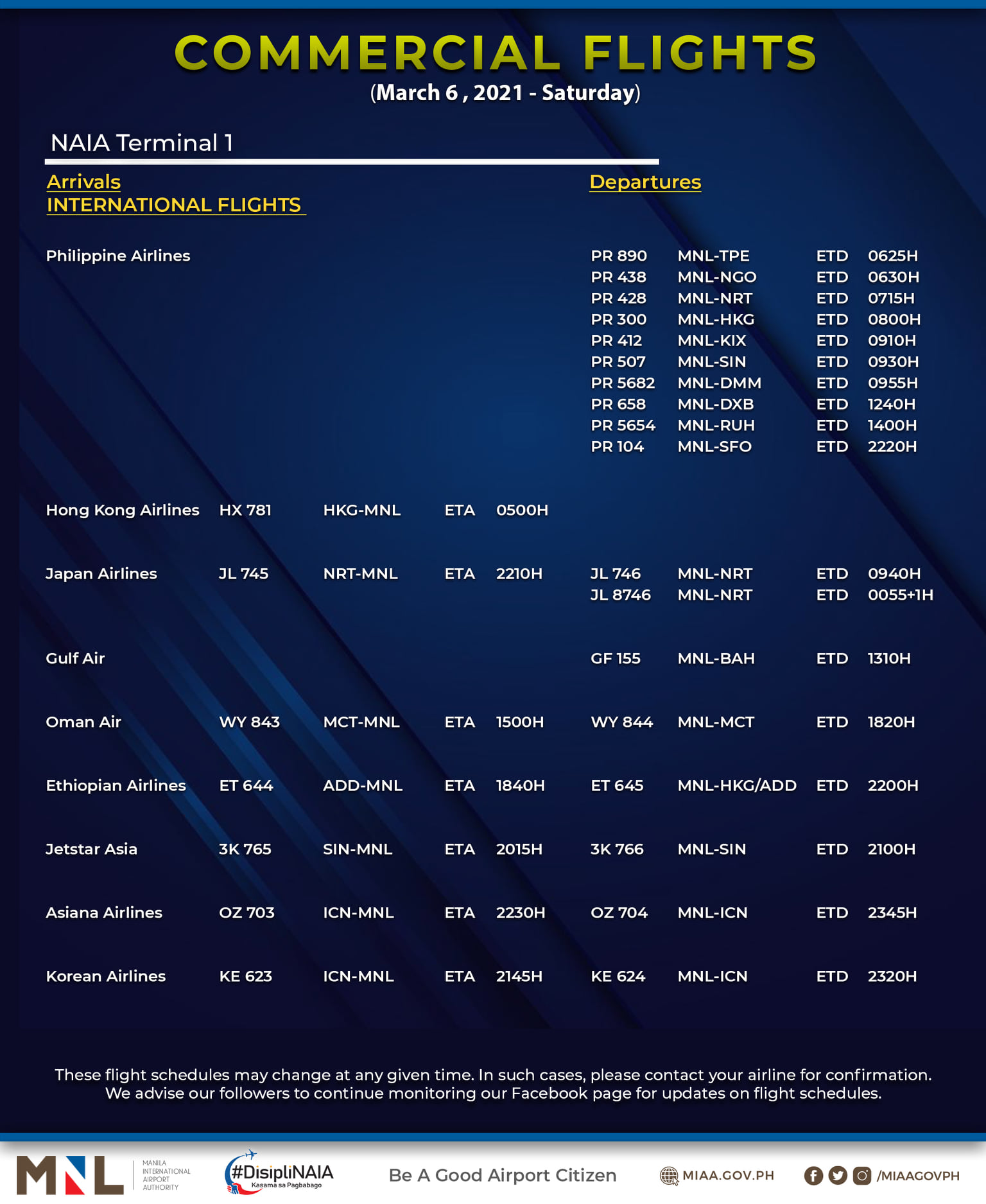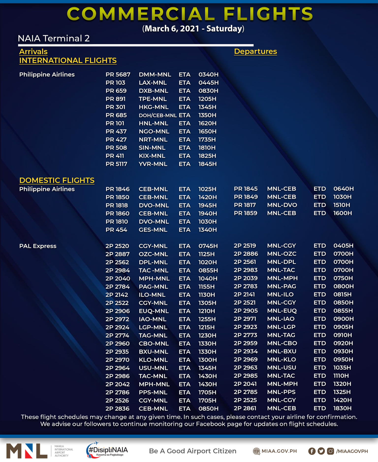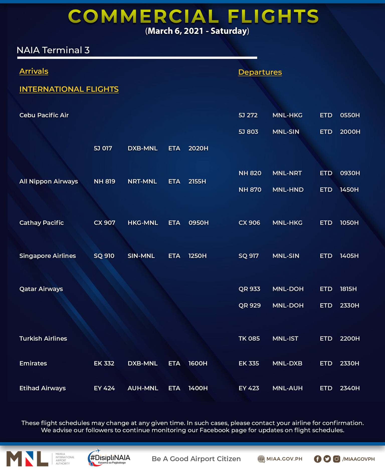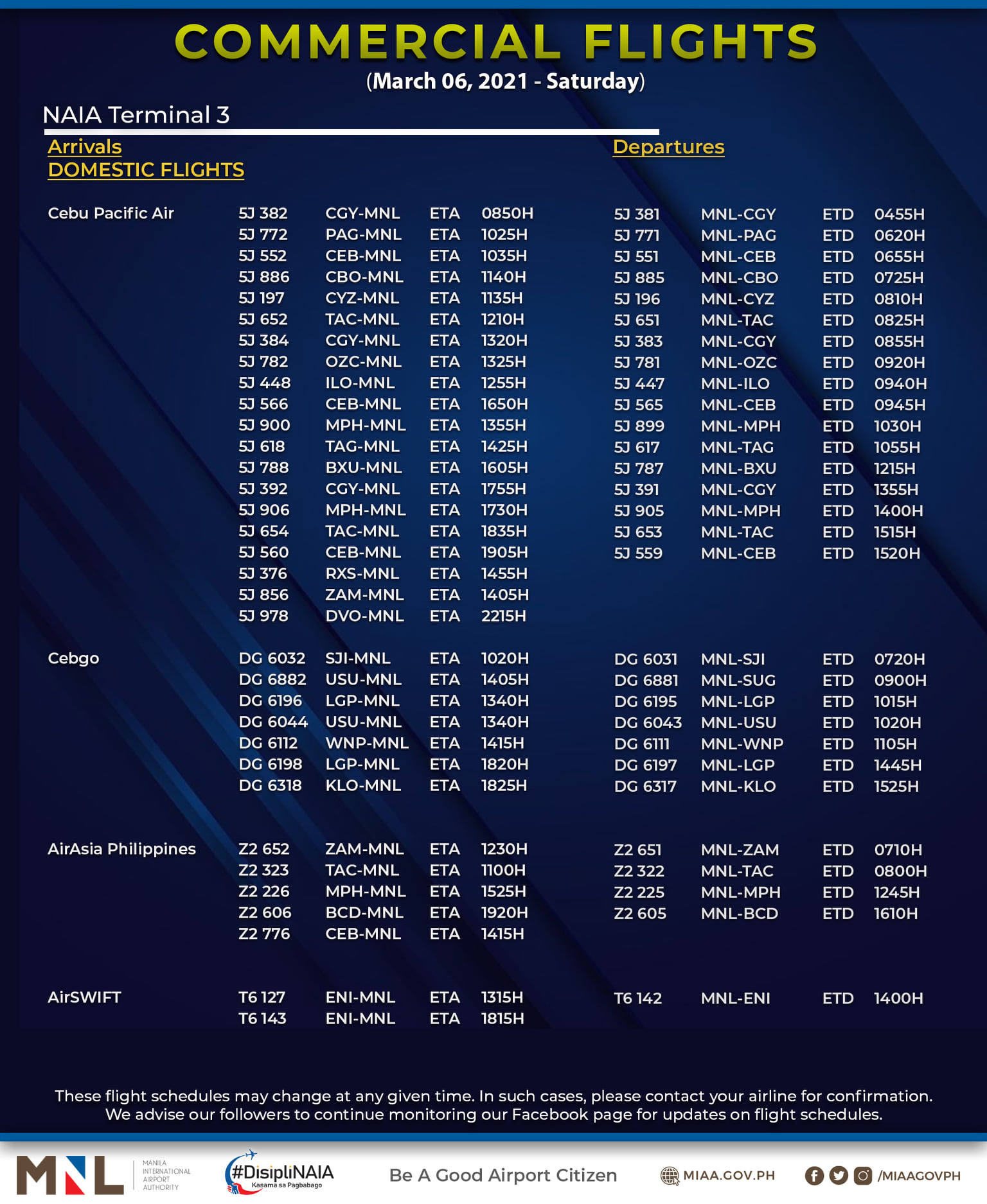 (Eagle News) — The Manila International Airport Authority has released its list of operational commercial flights for Saturday, March 6: