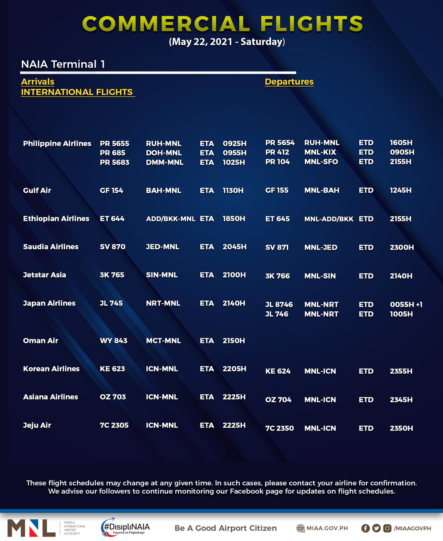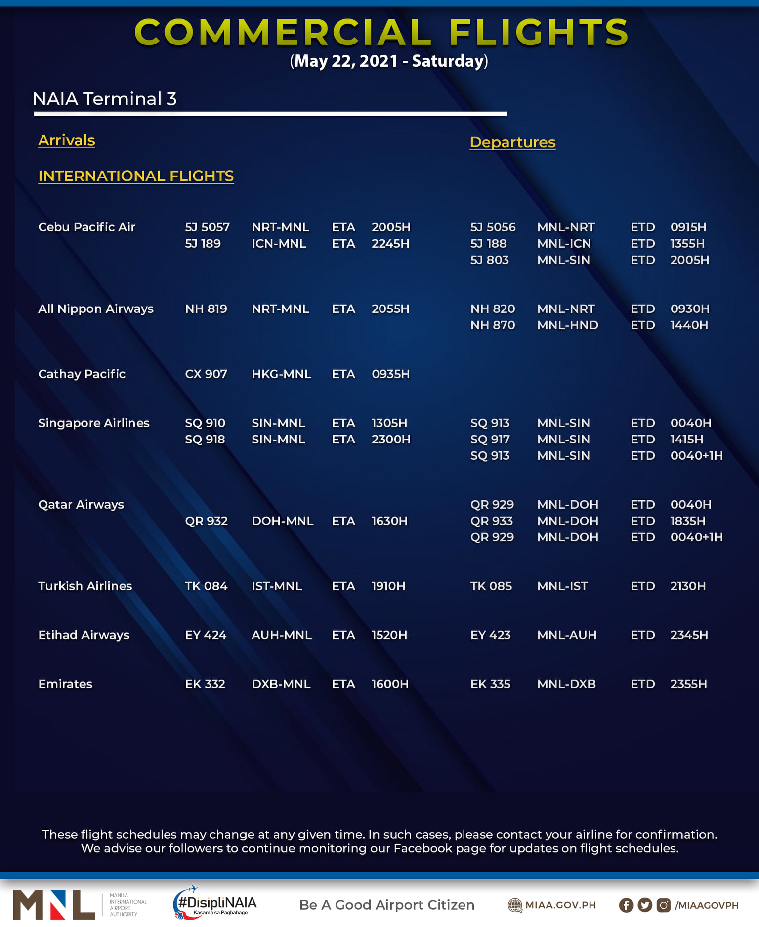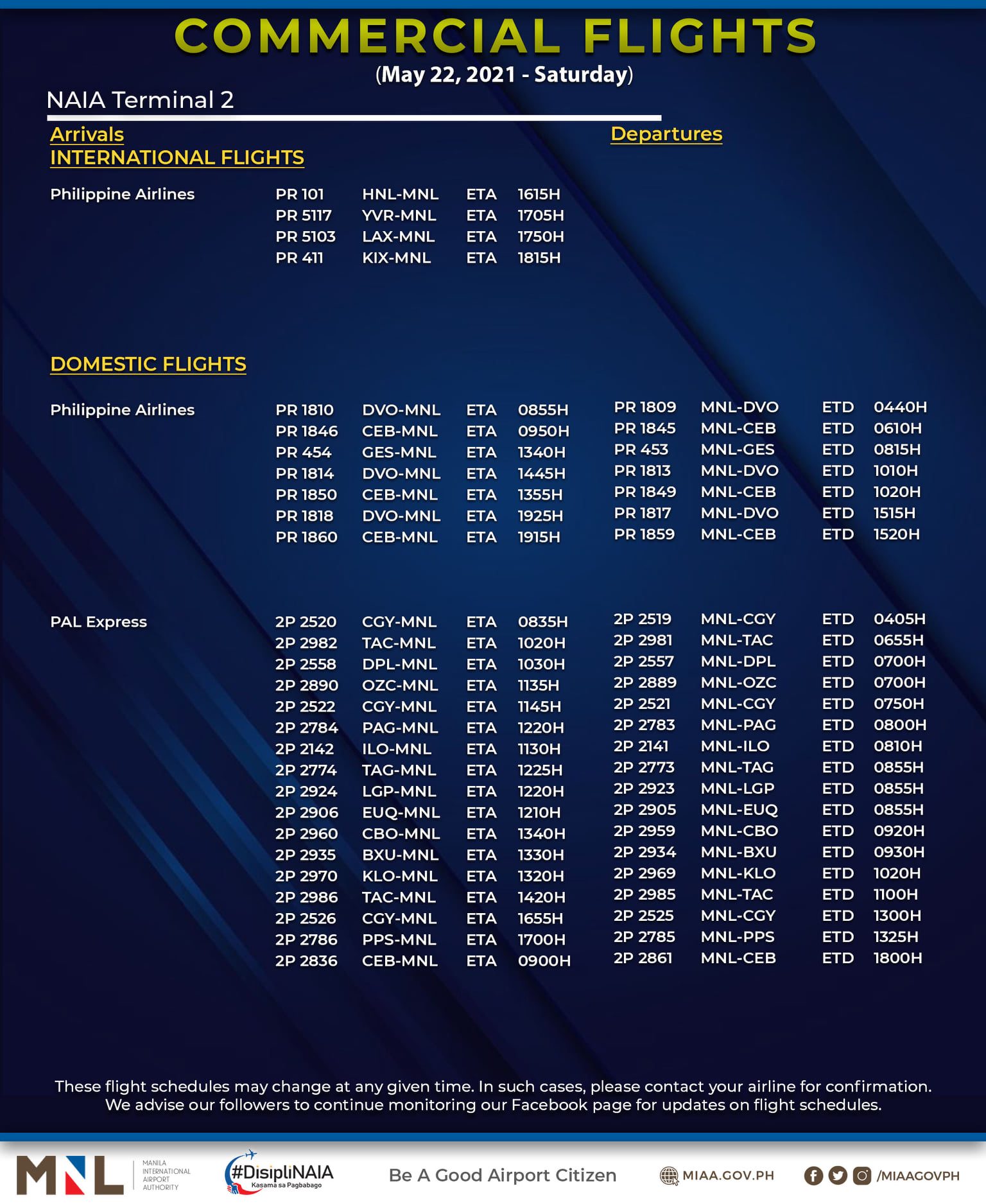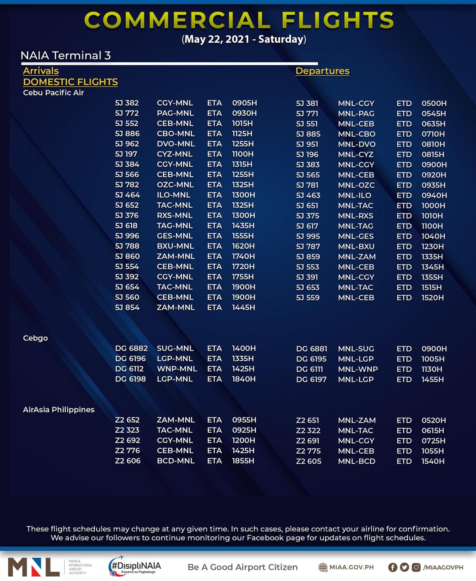 (Eagle News) — The Manila International Airport Authority has released its list of operational commercial flights for Saturday, May 22: