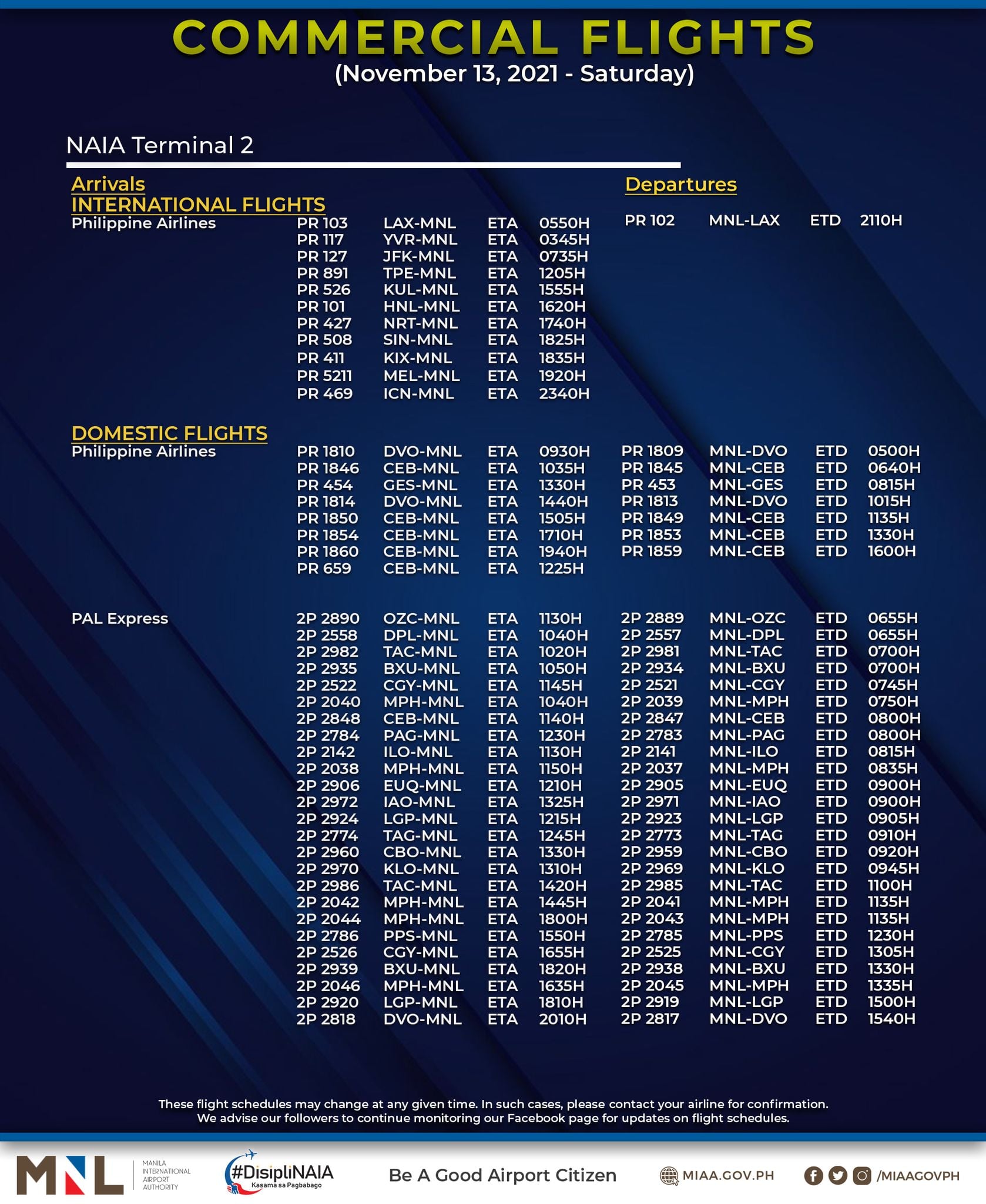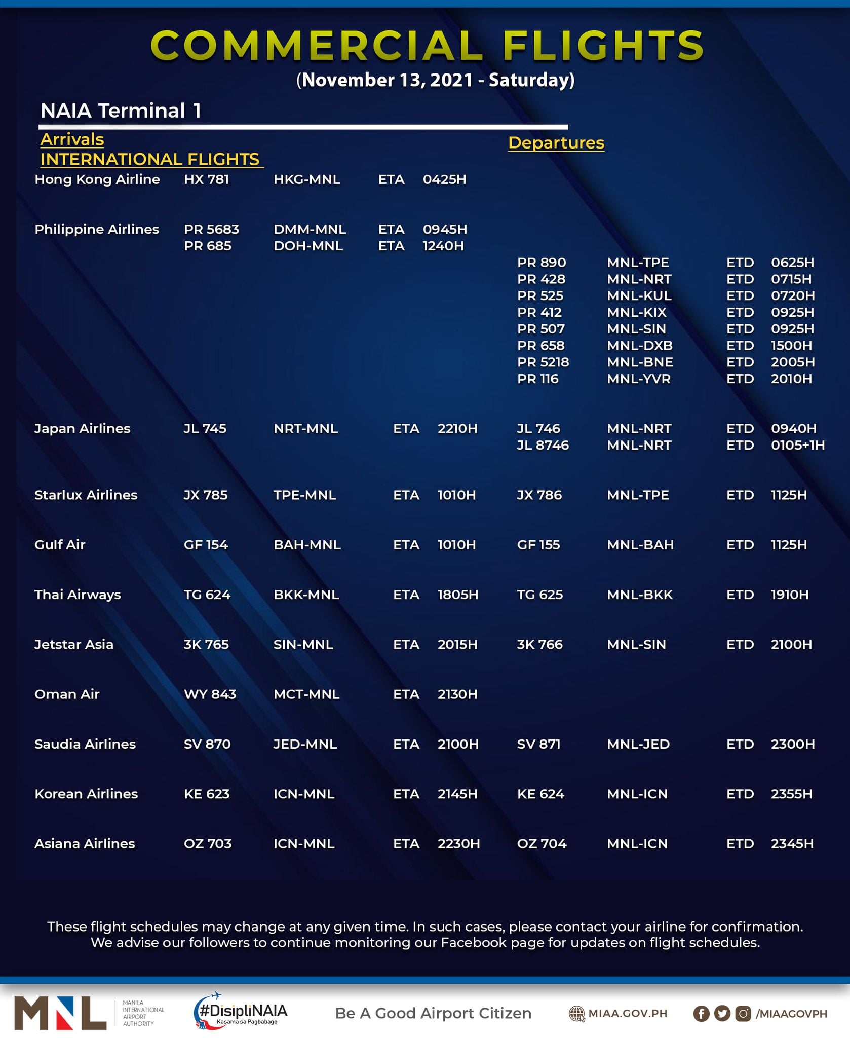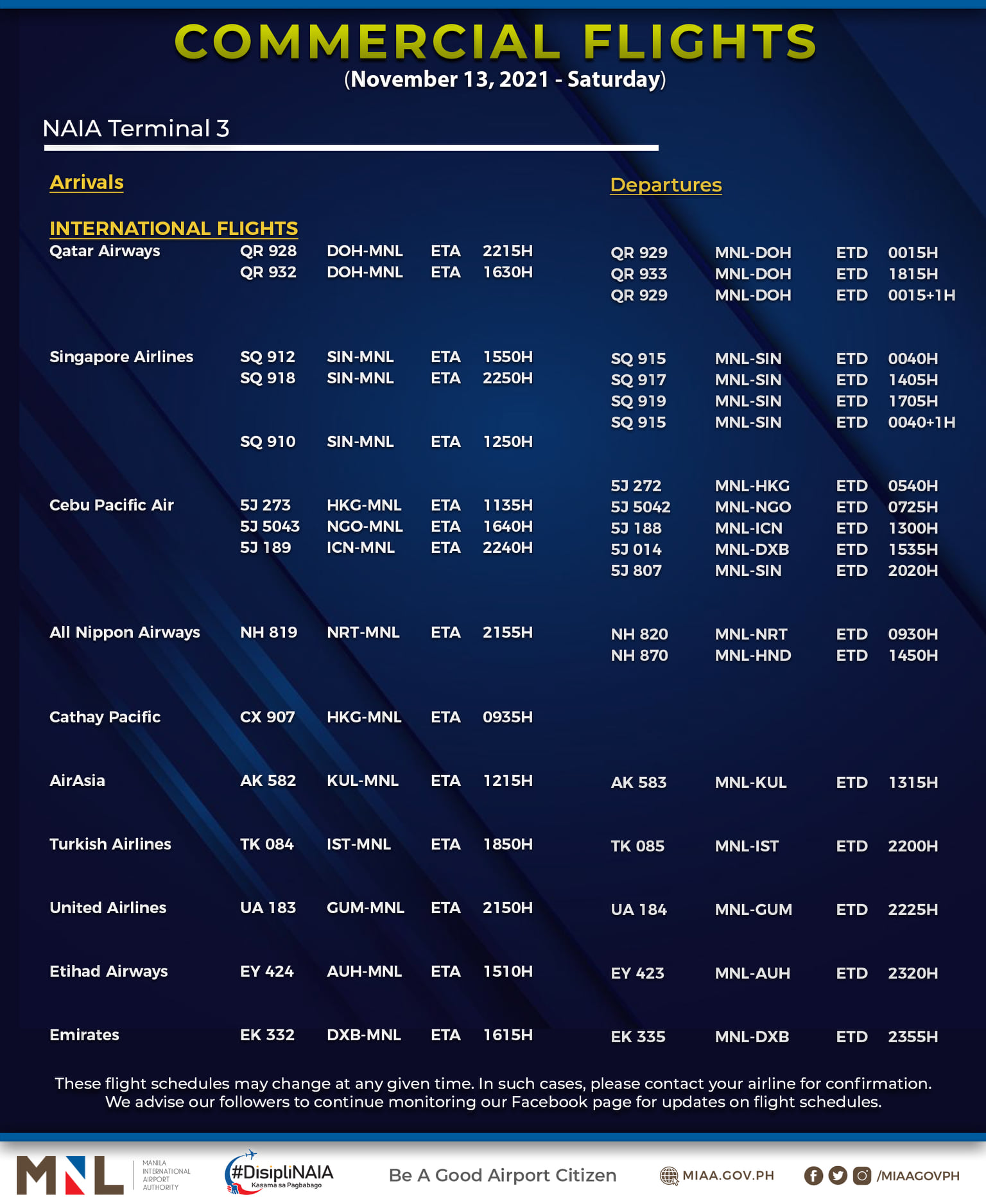 MIAA said flight schedules may change at any given time.