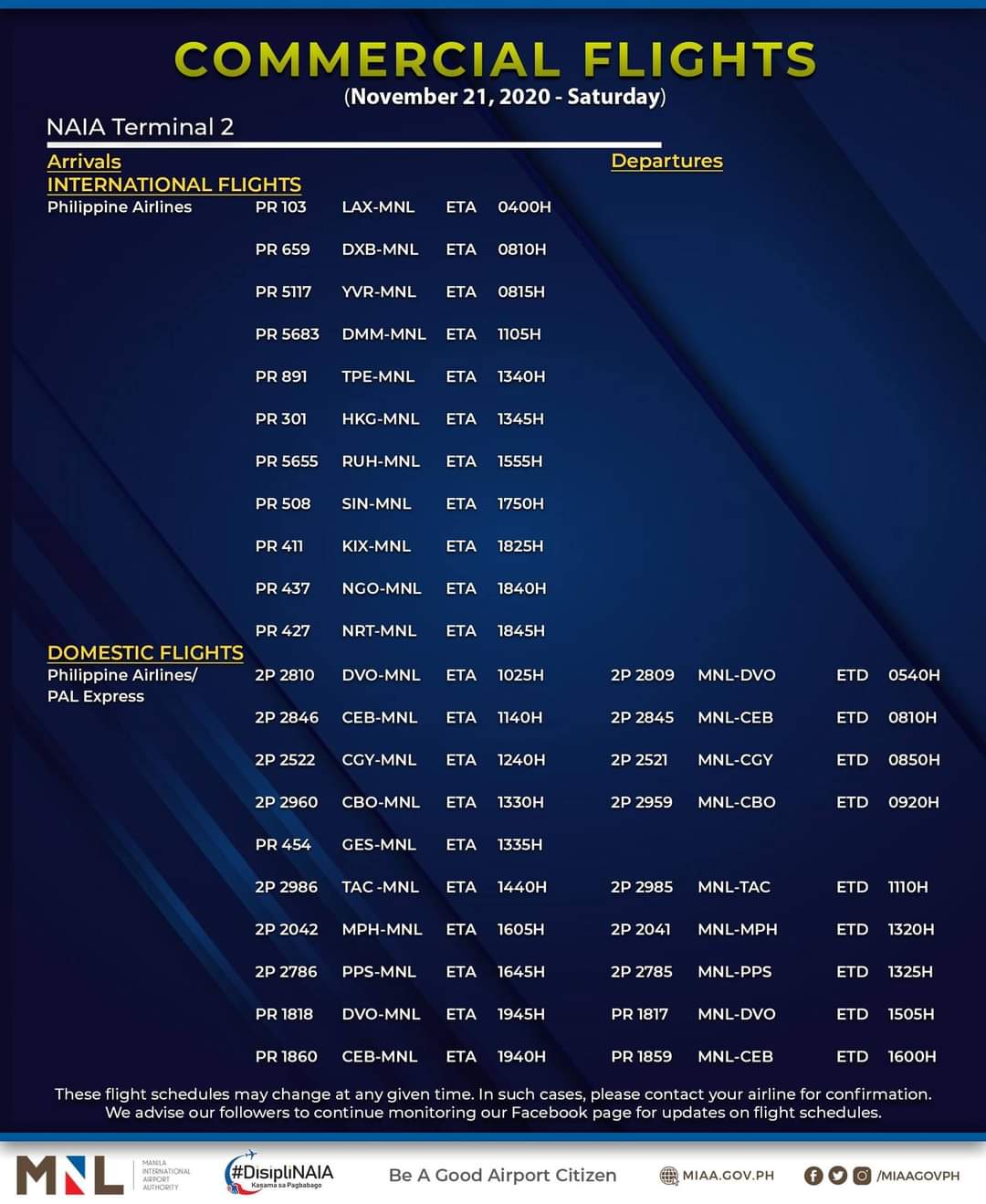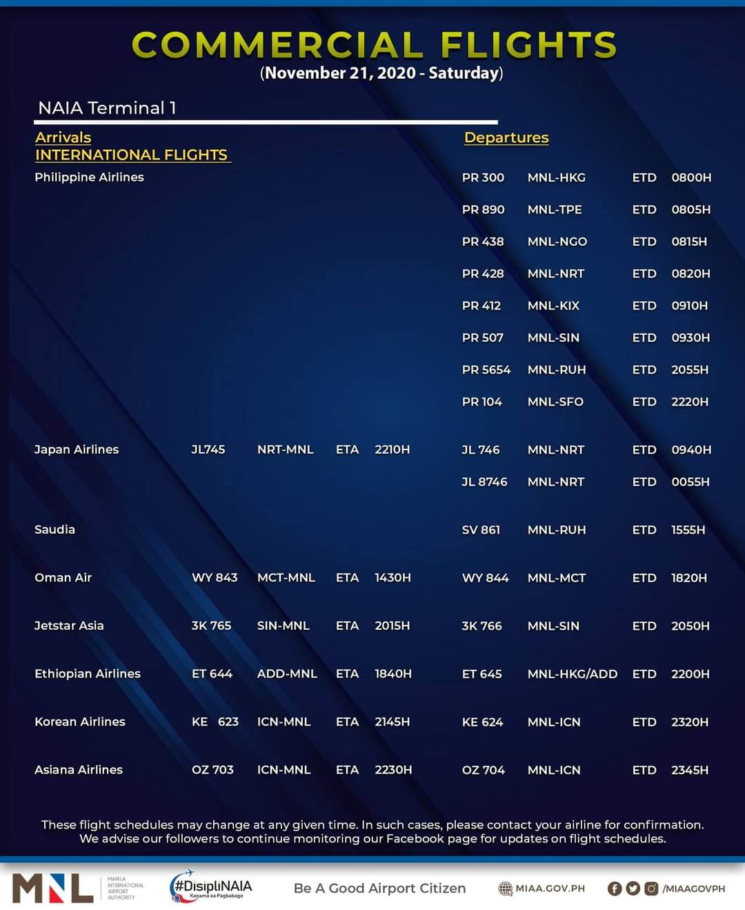 (Eagle News)–The Manila International Airport Authority has released its list of operational commercial flights for Saturday, Nov. 21: