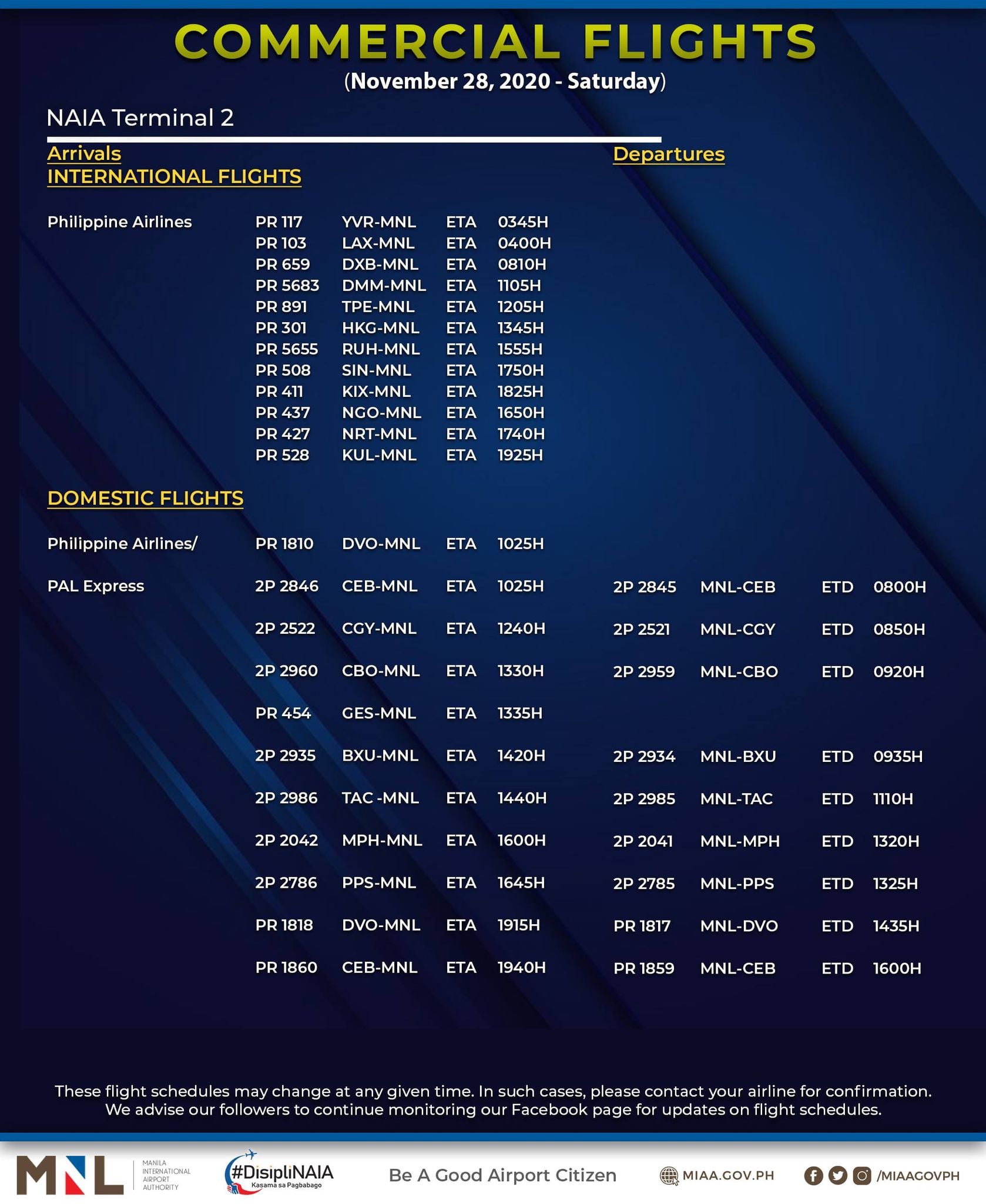 (Eagle News) — The Manila International Airport Authority has released its list of operational commercial flights for Saturday, Nov. 28: