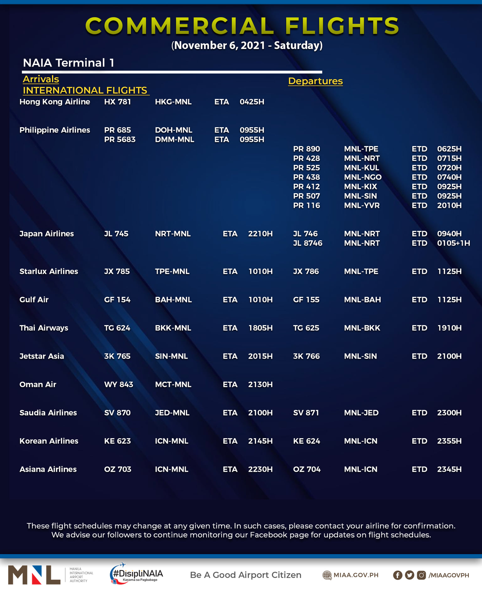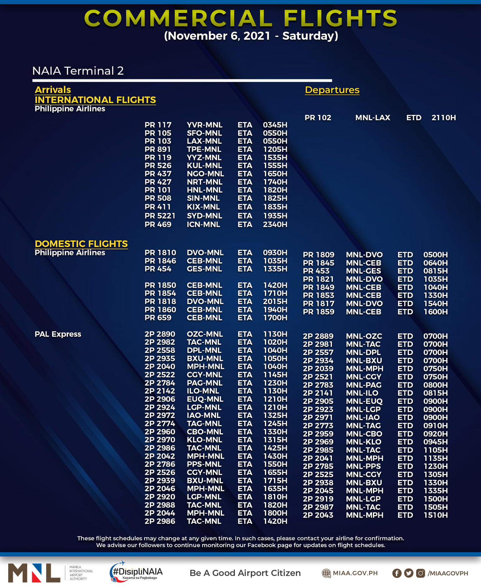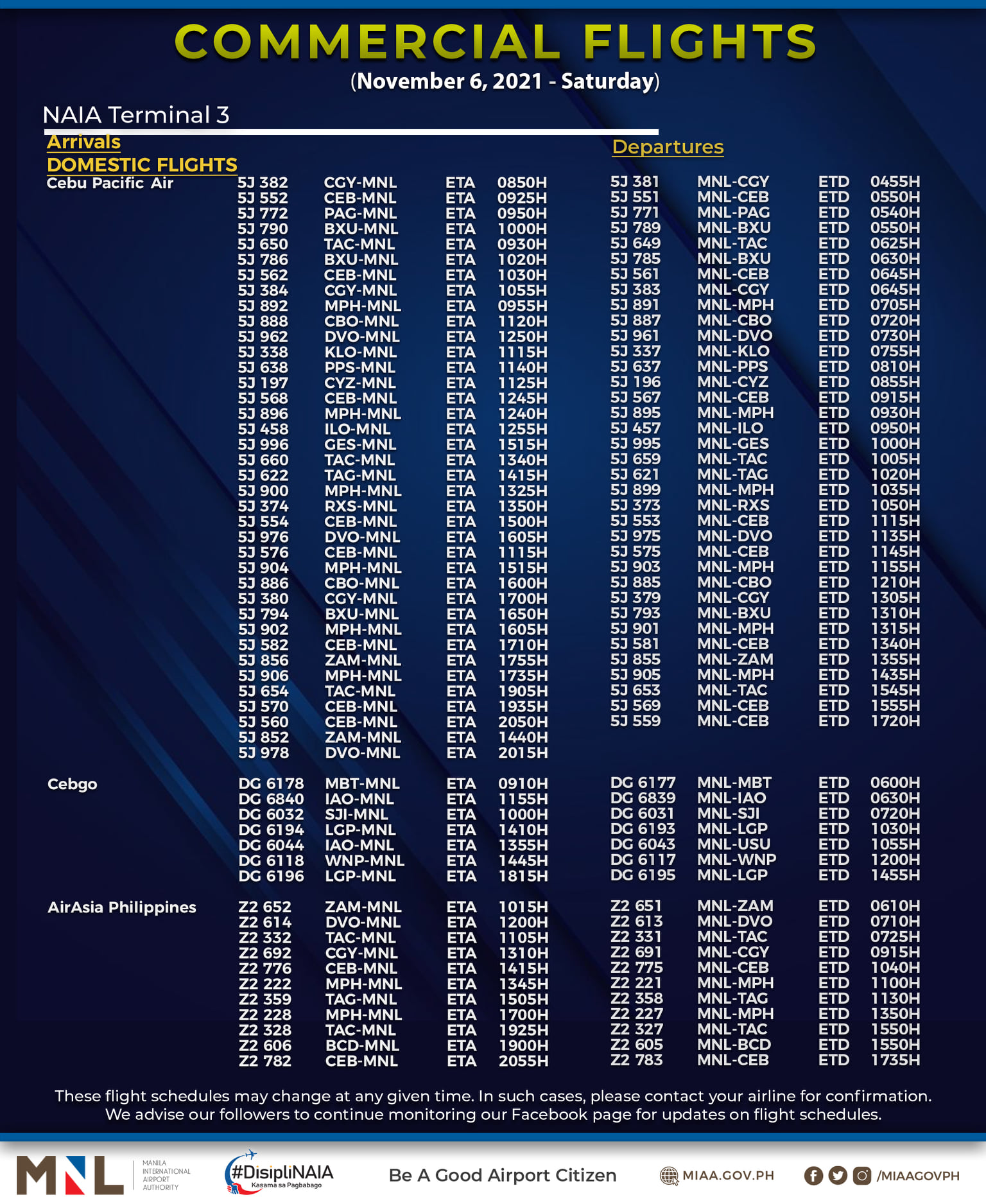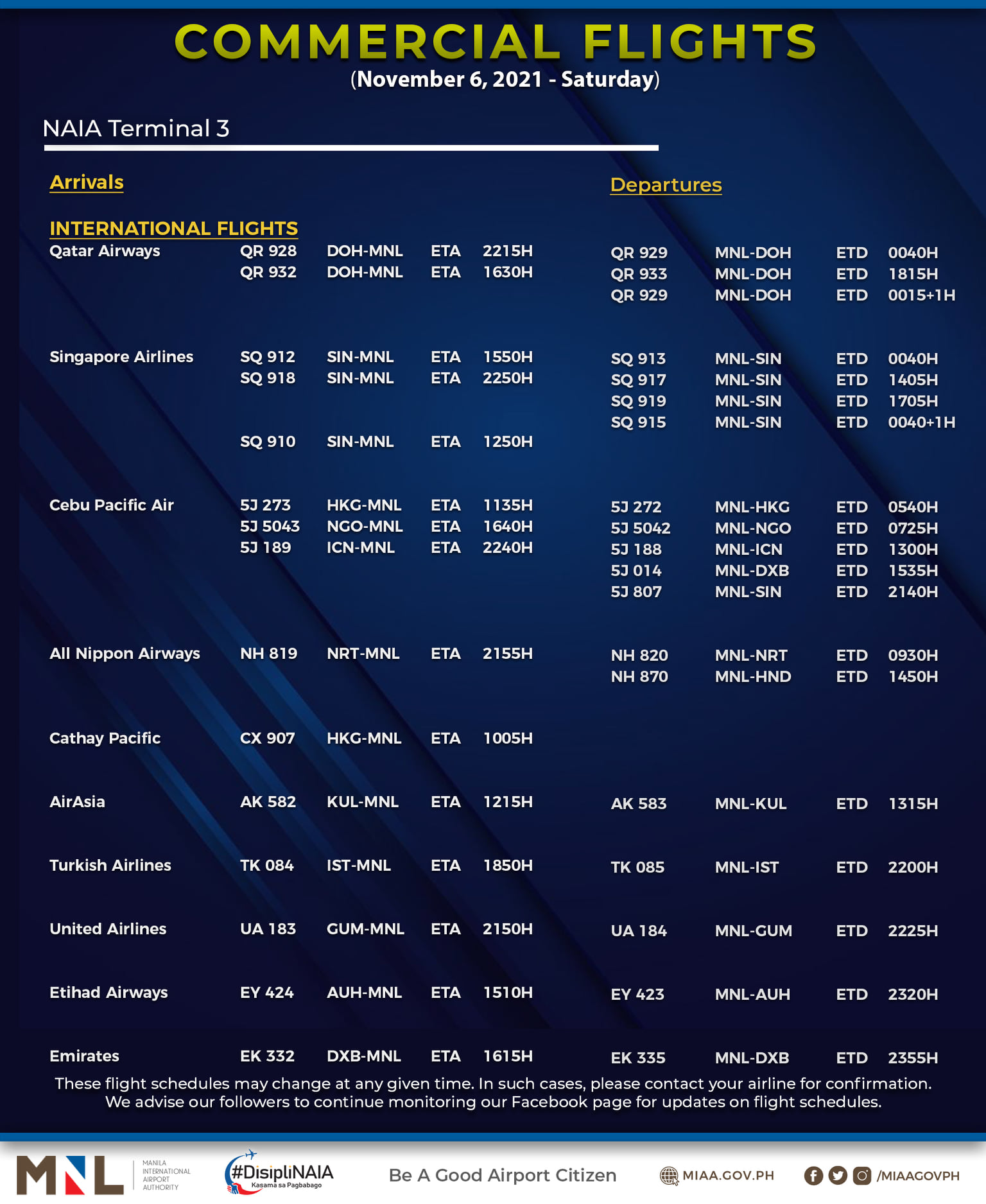 (Eagle News) — The Manila International Airport Authority has released its list of operational commercial flights for Saturday, Nov. 6: