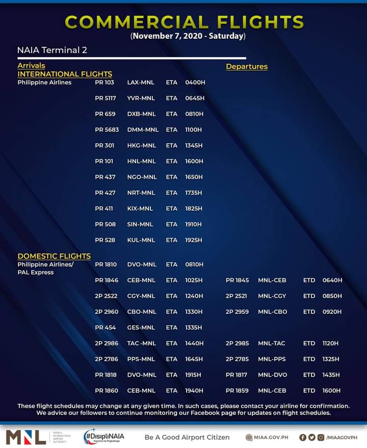 (Eagle News)–The Manila International Airport Authority has released its list of operational commercial flights for Saturday, Nov. 7: