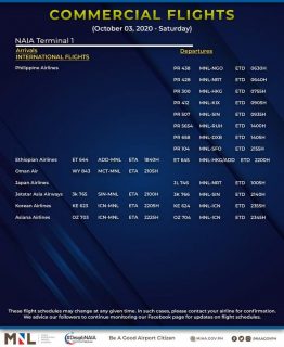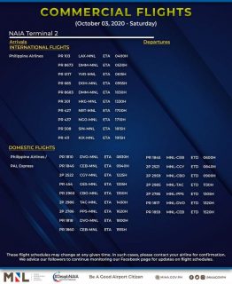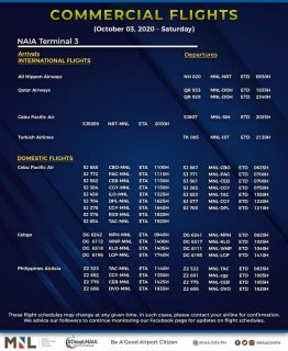(Eagle News)–The Manila International Airport Authority has released its list of operational commercial flights for Saturday, Oct. 3: