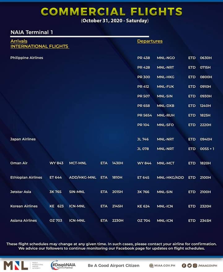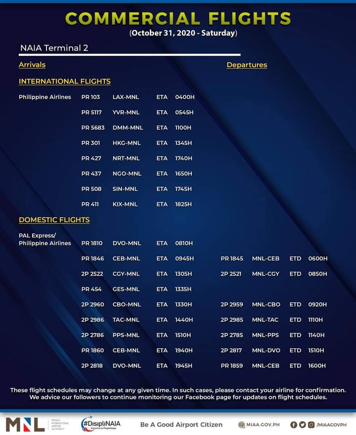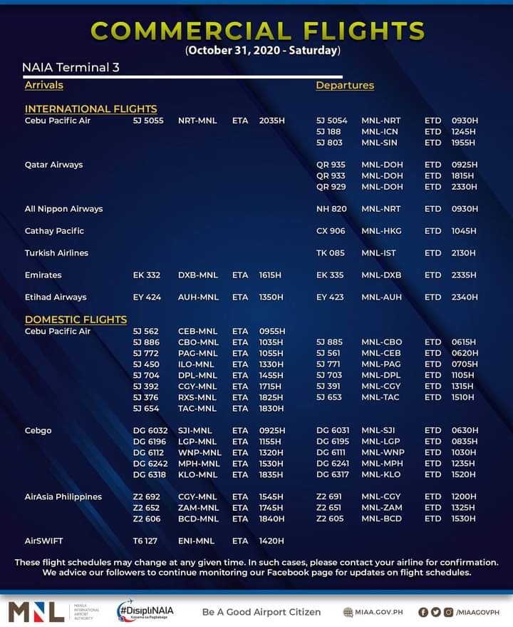 (Eagle News)–The Manila International Airport Authority has released its list of operational commercial flights for Saturday, Oct. 31:
