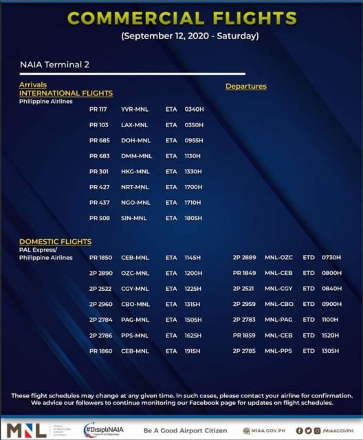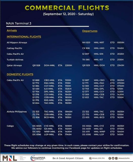 (Eagle News)–The Manila International Airport Authority has released its list of operational commercial flights for Saturday, Sept. 12: