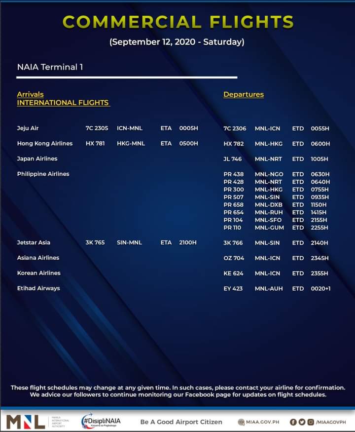(Eagle News)–The Manila International Airport Authority has released its list of operational commercial flights for Saturday, Sept. 12: