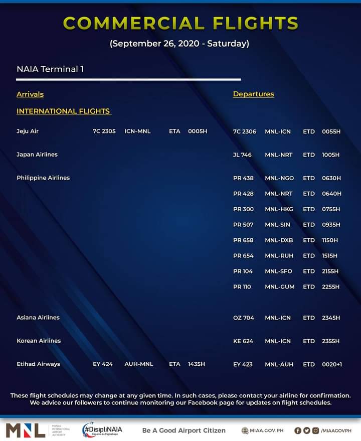 (Eagle News)–The Manila International Airport Authority has released its list of operational commercial flights for Saturday, Sept. 26: