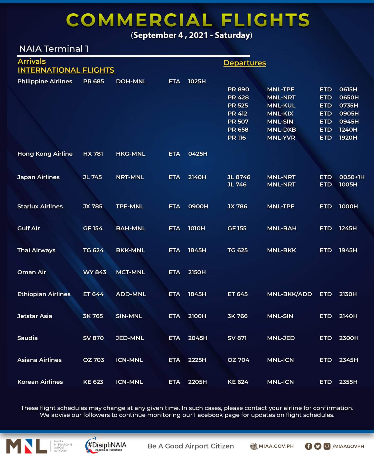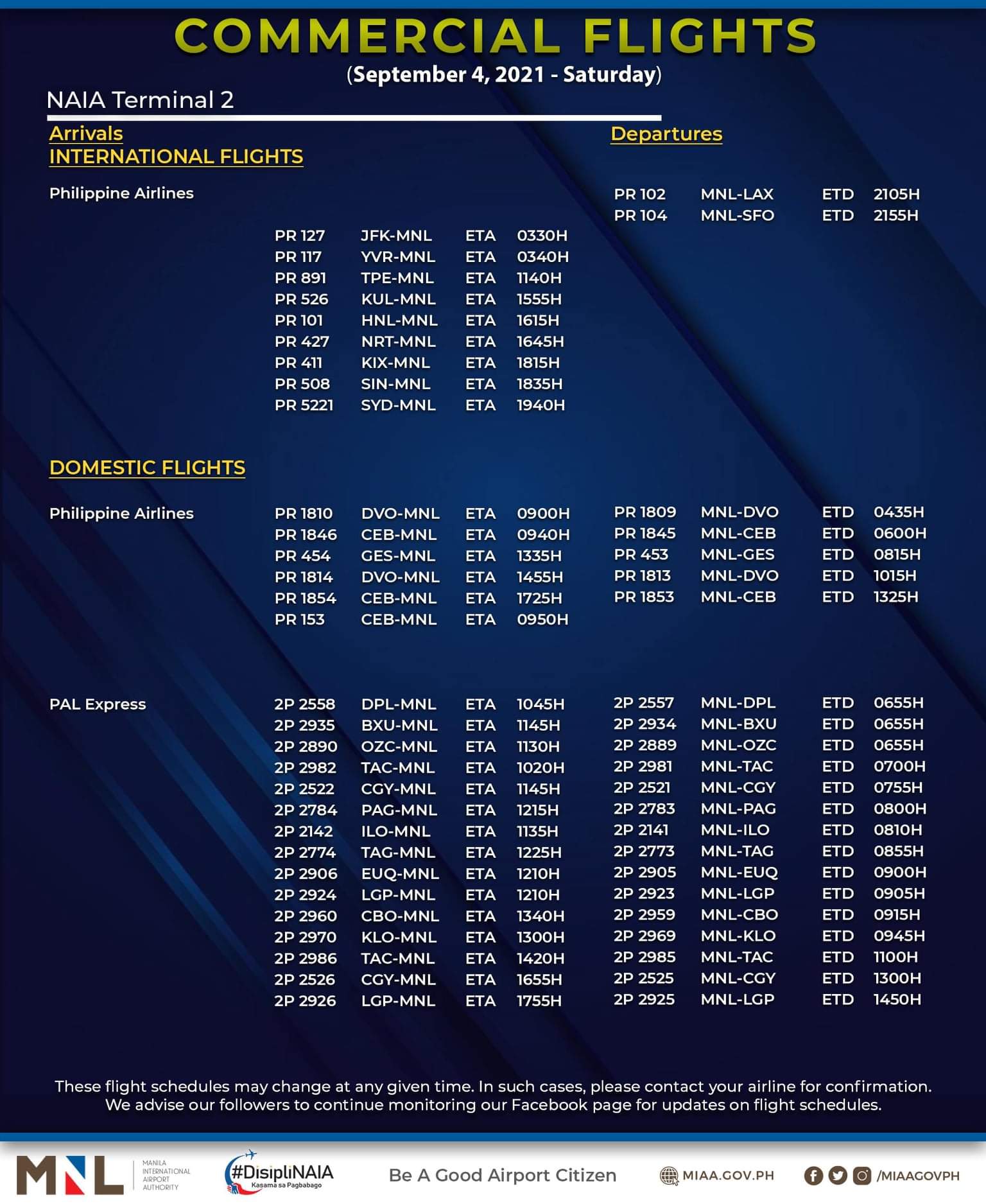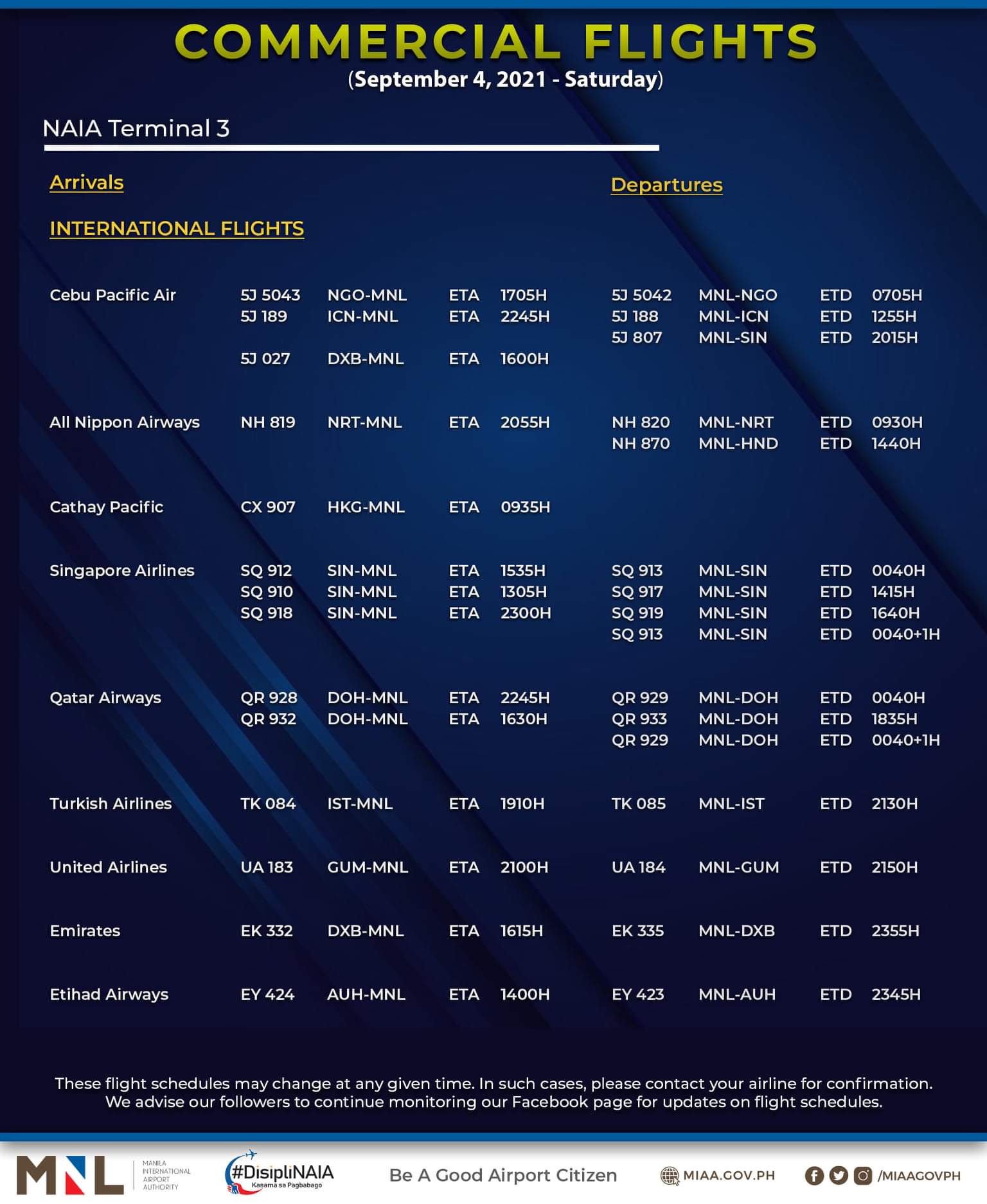 (Eagle News)–The Manila International Airport Authority has released its list of operational commercial flights for Saturday, Sept. 4: