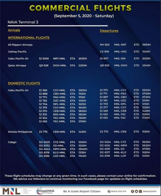 (Eagle News)-The Manila International Airport Authority has released its list of operational commercial flights for Saturday, Sept. 5: