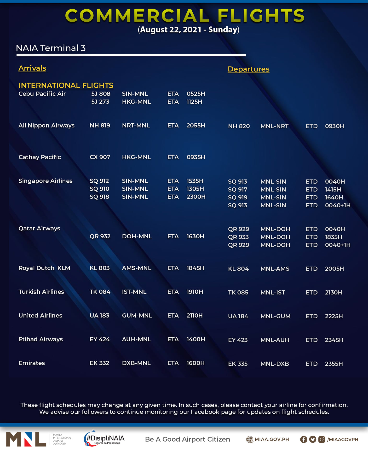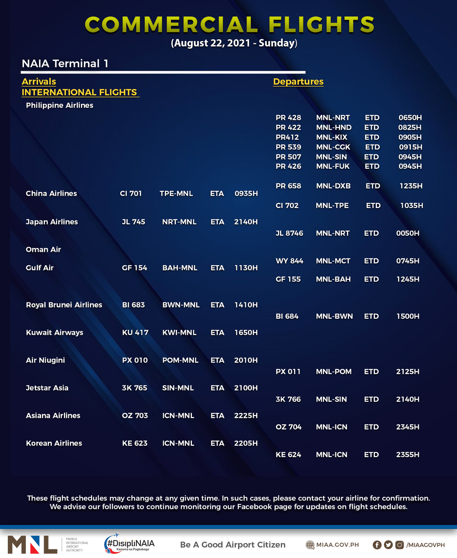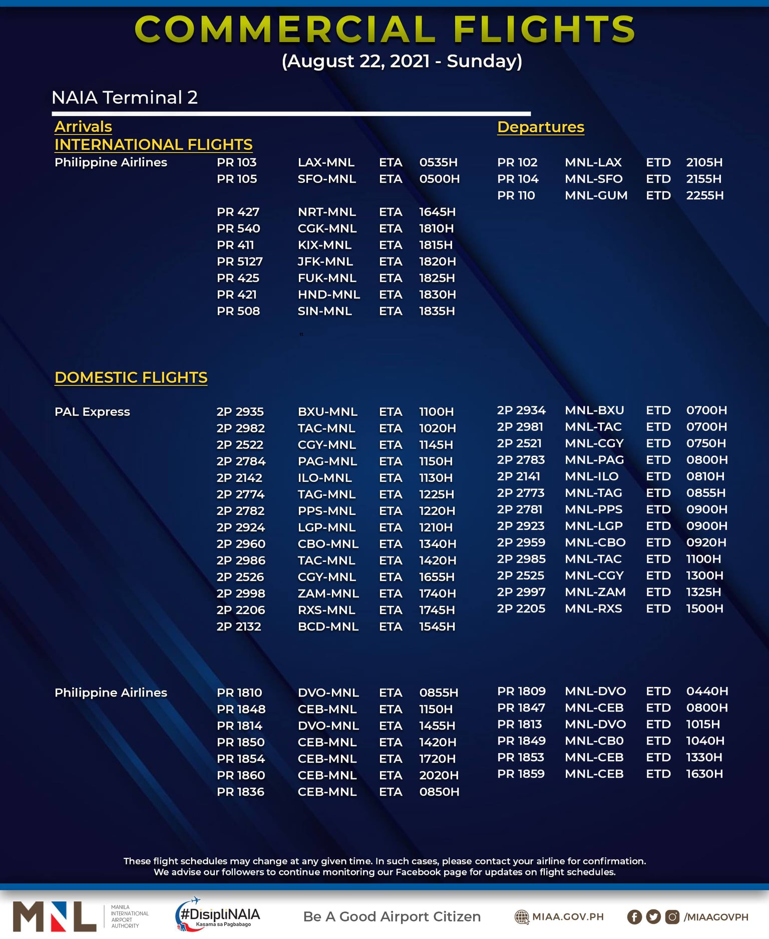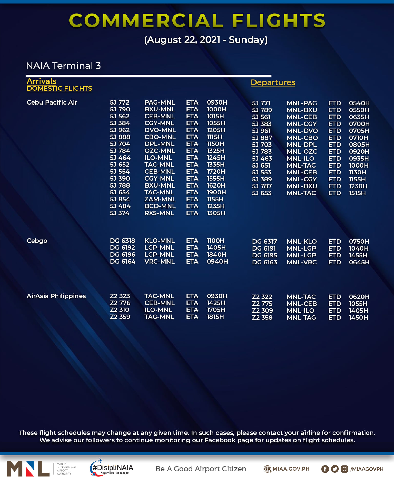 (Eagle News) — The Manila International Airport Authority has released its list of operational commercial flights for Sunday, Aug. 22: