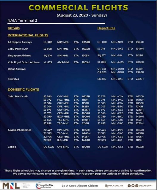 (Eagle News)–The Manila International Airport Authority has released its list of operational commercial flights for Sunday, Aug. 23: