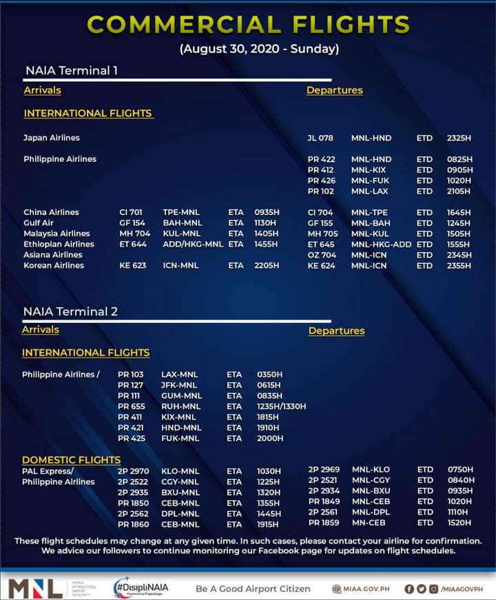 (Eagle News)–The Manila International Airport Authority has released its list of operational commercial flights for Sunday, Aug. 30:
