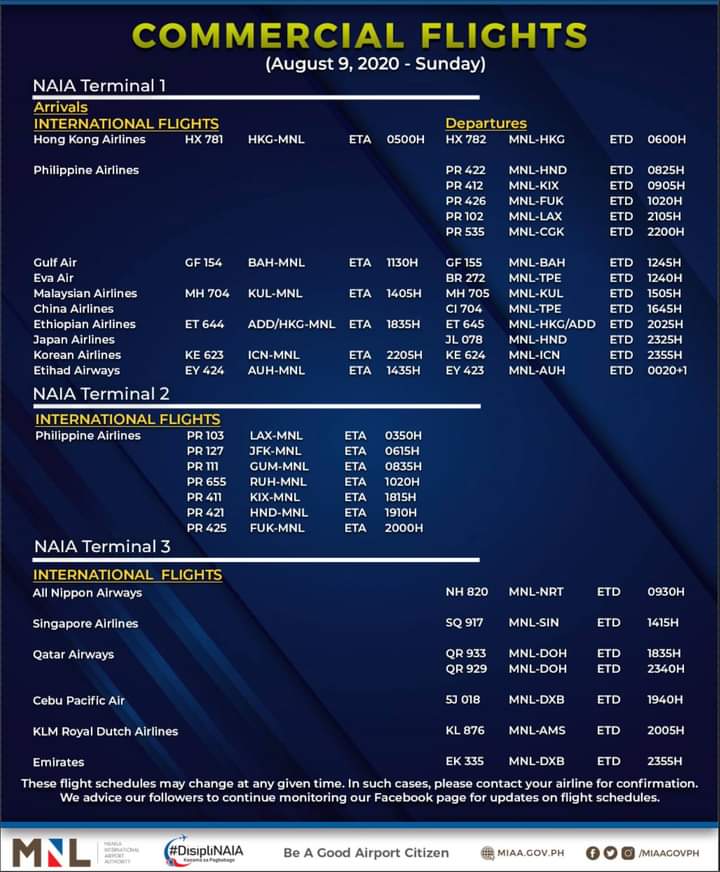 (Eagle News)–The Manila International Airport Authority has released its list of operational commercial flights for Sunday, Aug. 9:
