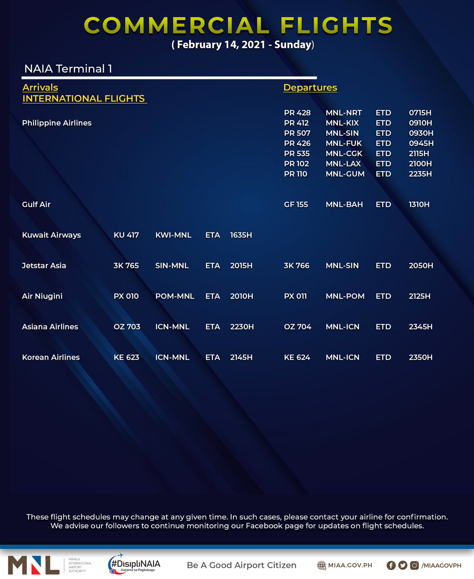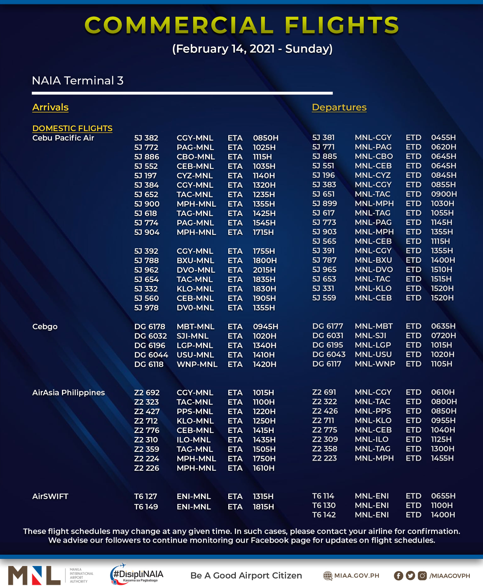 (Eagle News) — The Manila International Airport Authority has released its list of operational commercial flights for Sunday, Feb. 14: