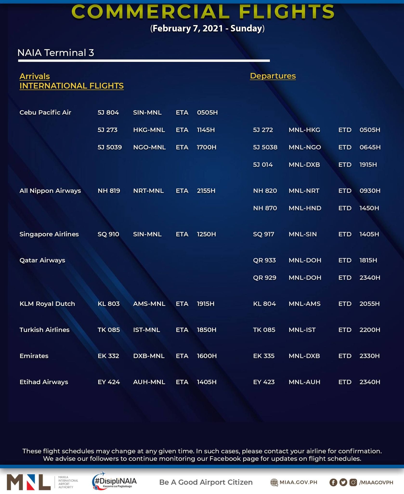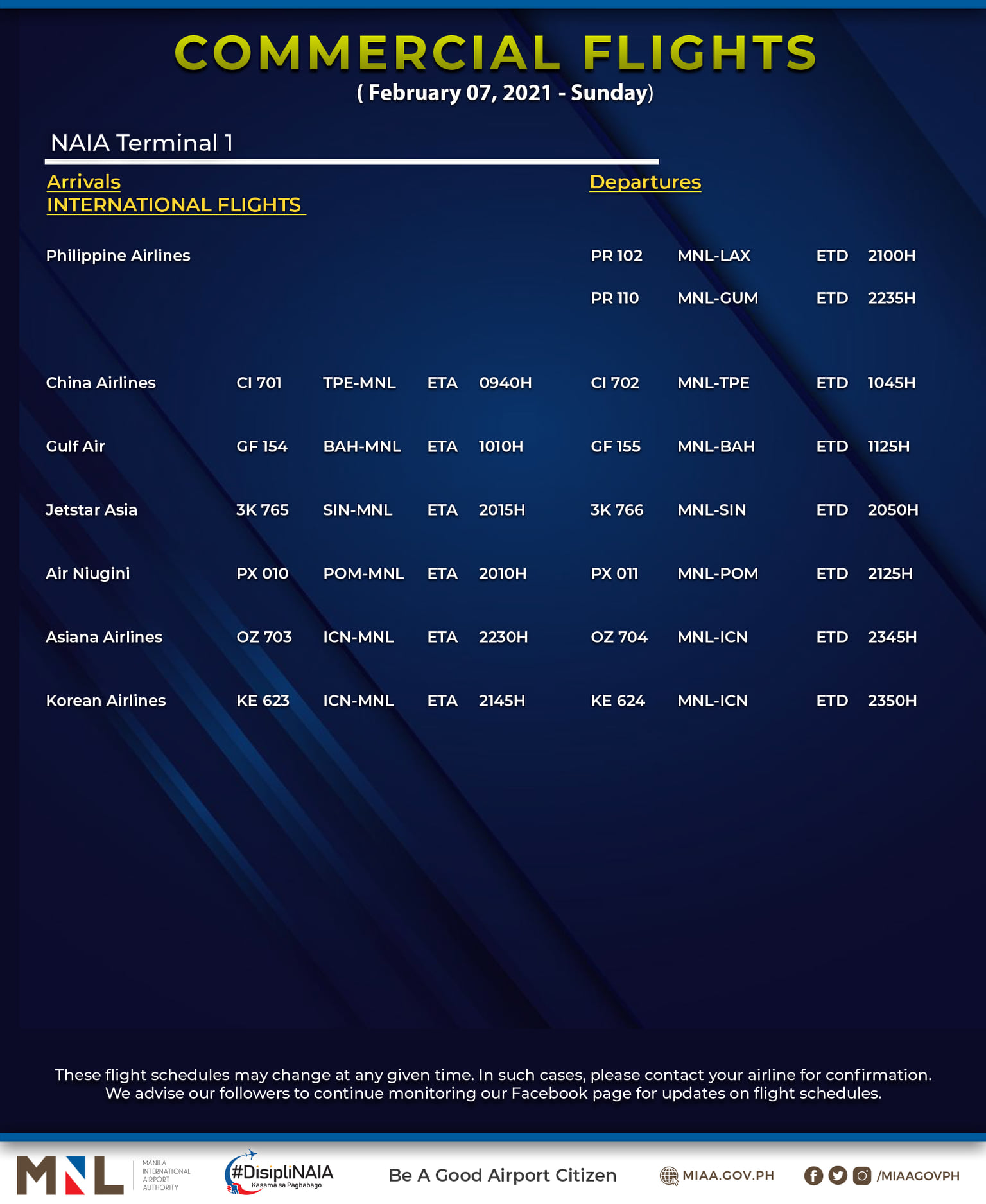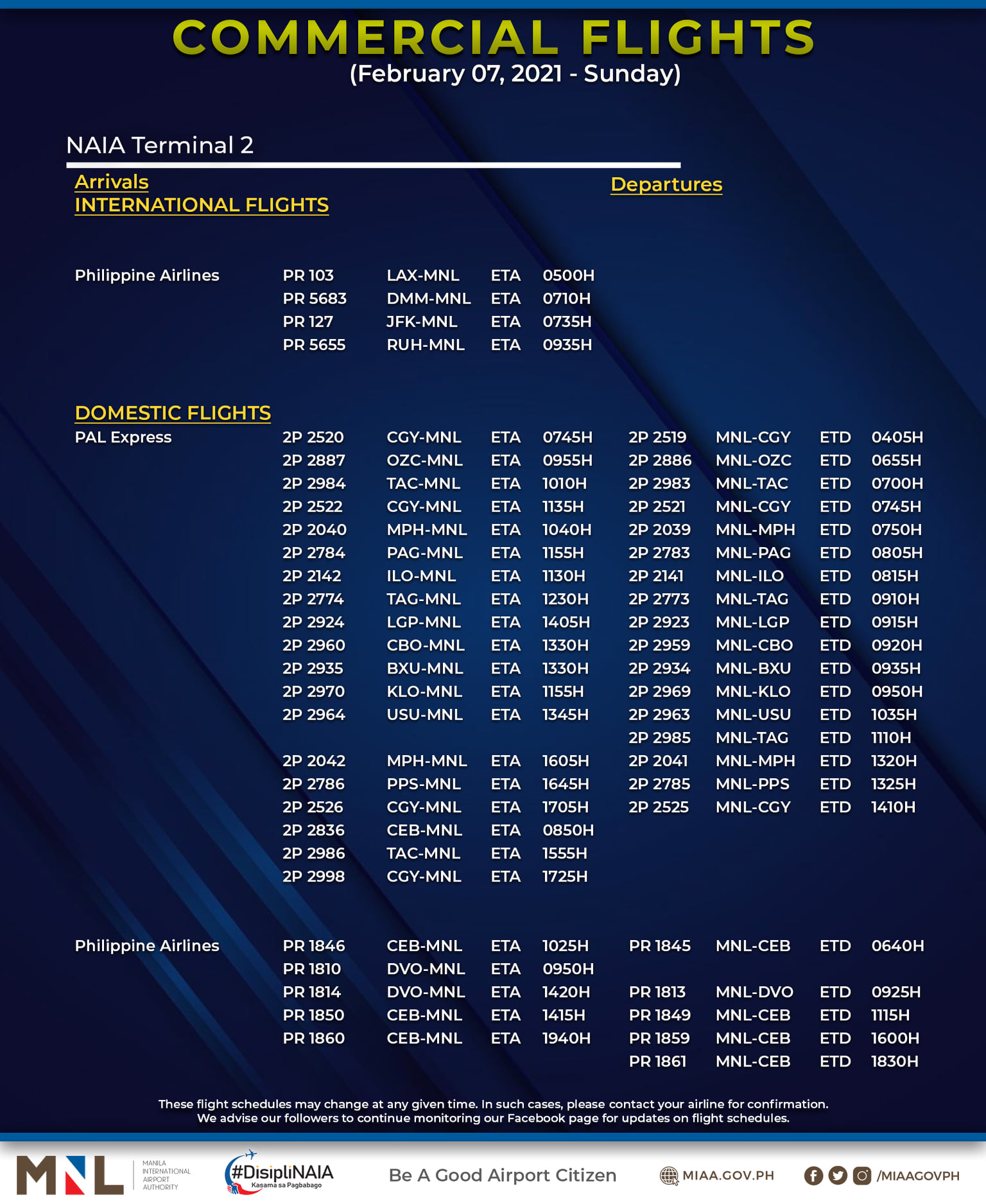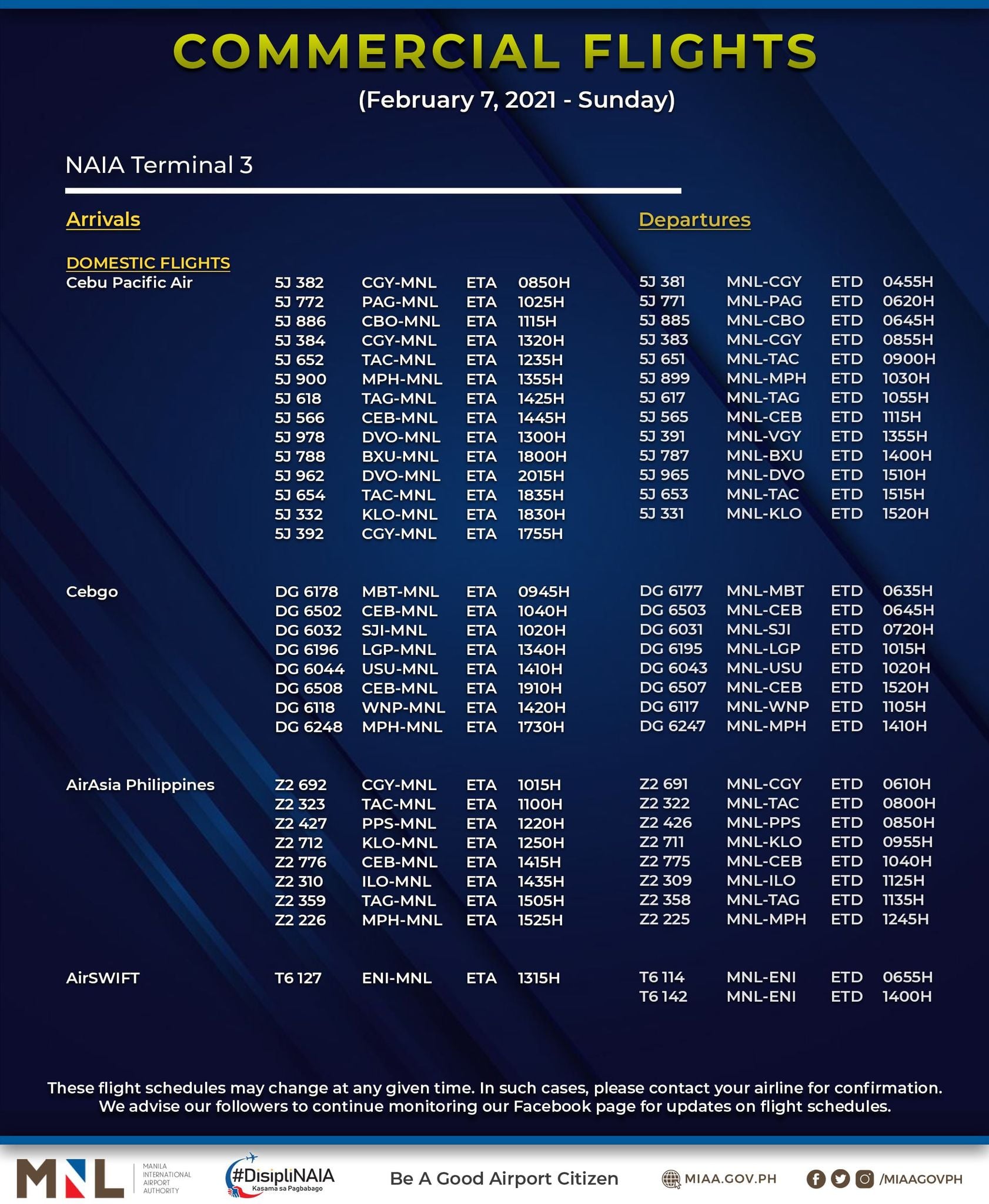 (Eagle News) — The Manila International Airport Authority has released its list of operational commercial flights for Sunday, Feb. 7: