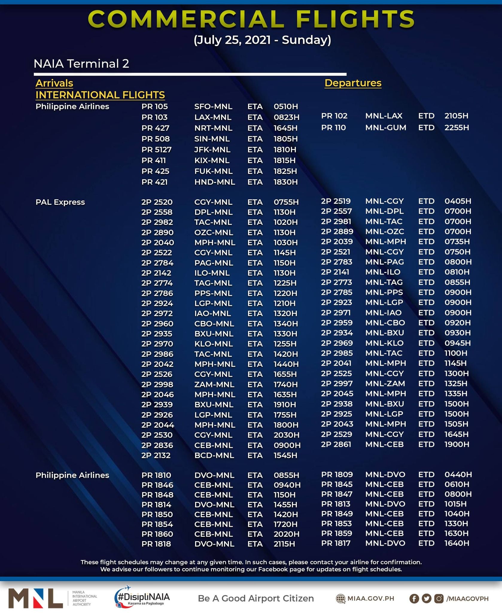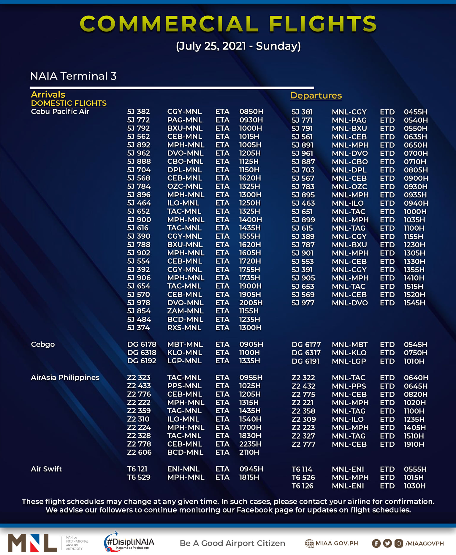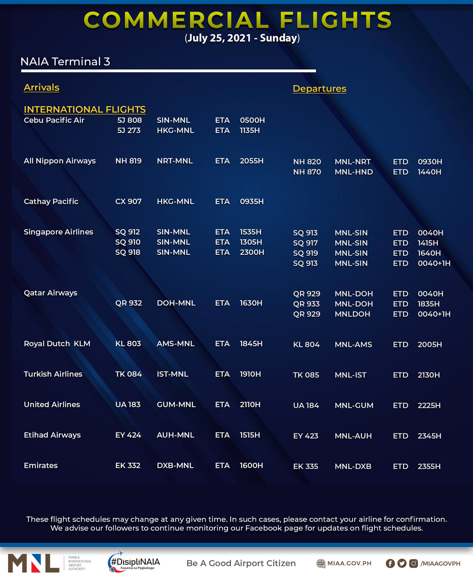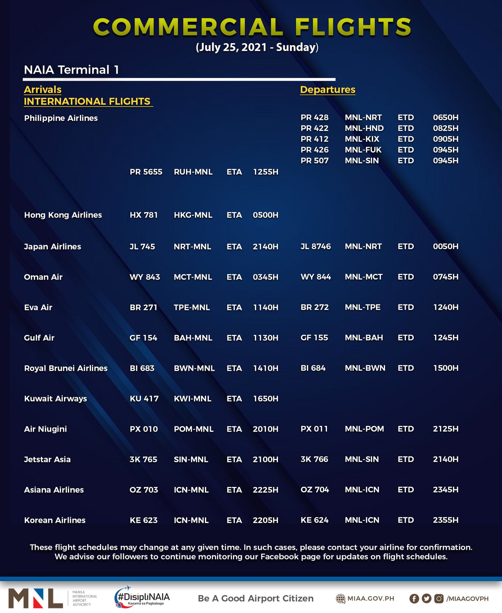 (Eagle News) — The Manila International Airport Authority has released its list of operational commercial flights for Sunday, July 25: