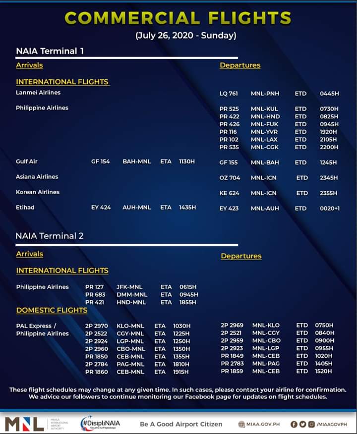 (Eagle News)βThe Manila International Airport Authority has released its list of operational commercial flights for Sunday, July 26: