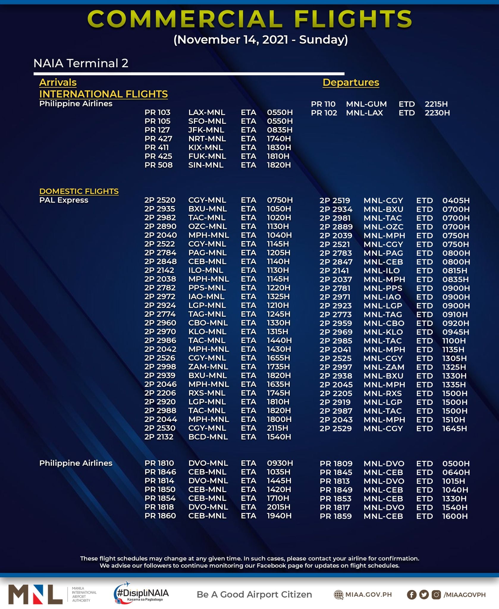 (Eagle News) — The Manila International Airport Authority has released its list of operational commercial flights for Sunday, Nov. 14: